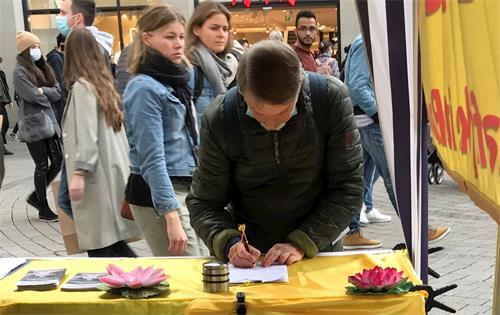 金发的米勒(Müller)女士和先生一起来到信息台,问哪里可以签名。多年前她曾接到过法轮功的传单,已经知道真相,她问法轮功学员:“签名能起到什么作用吗?”学员告诉她:“当然可以,比如说今年九月份德国国会请愿委员会举办了公开听证会,就是因为我们的请愿活动收集了足够多的签名,所以当然能起作用;而且现在越来越多的国家做出决议,问责践踏人权、迫害法轮功的中共责任人。”米勒女士听了欣然签了名。
