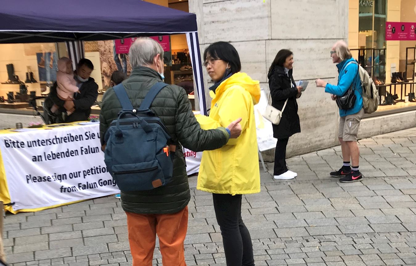 申克尔(Schinker)女士手里拿着传单来到信息台:“这些人为什么会被迫害?(中共)为什么要迫害法轮功学员?”学员告诉她:“就是因为炼法轮功的人太多了,而且这些人都遵循自己的良知,无法被中共所操控,所以中共认为这是对它独裁统治的威胁。中共对被关押的法轮功学员体检,建立了一个数据库,可以根据需要在数据库里寻找活体器官进行移植卖钱。”听着介绍,这位善良的女士无法接受(如此残酷的事实),用手捂着嘴巴,声音都哽咽了,马上签了名,临走时,她祝福学员:“祝你们成功!”