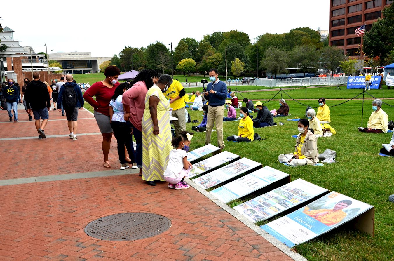 丝黛拉(Stella)一家四口人从乔治亚州来费城度假,她在法轮功真相展板面前逗留了很长时间,对展板逐一仔细观看。出生于基督教家庭的丝黛拉认为,人们应该互相关心,而不是像中共宣传鼓动地那样斗来斗去的。她祝法轮功学员能够早日在中国大陆恢复炼功自由。