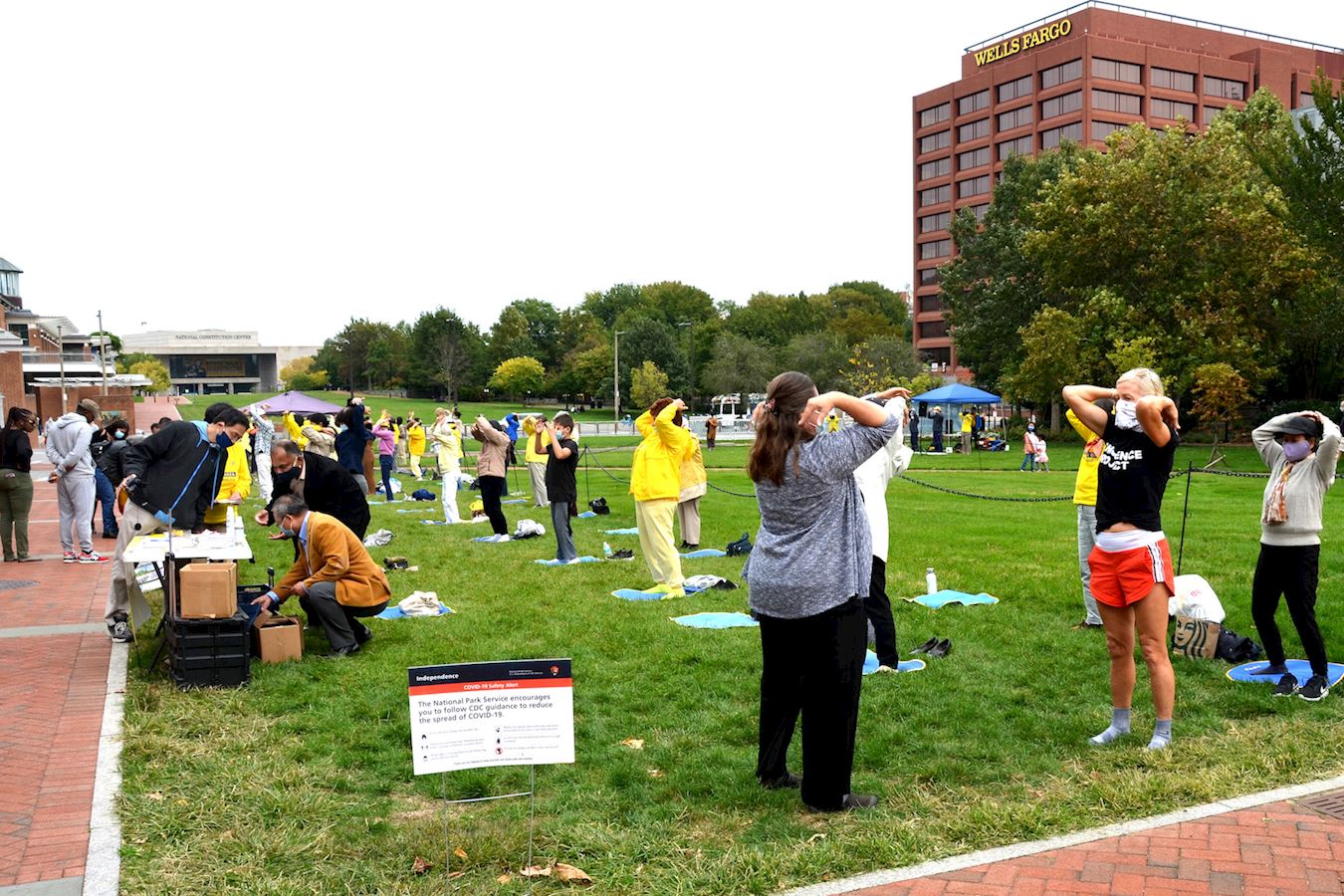 ![]() 图1:部份大费城地区法轮功学员于2020年10月10日在自由钟景点集体炼功。 |