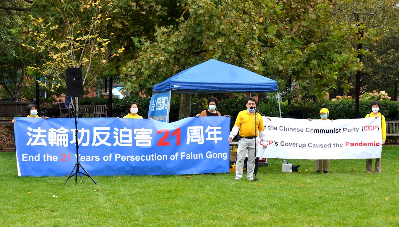 集会主持人、法轮功学员亚历克斯(Alex)宣读了宾州州长沃夫(Tom Wolf)庆祝法轮大法弘传世界第28周年的贺信。因为受疫情影响,很多政府部门关闭了好几个月,不久前刚刚收到宾州州长发来的贺信。