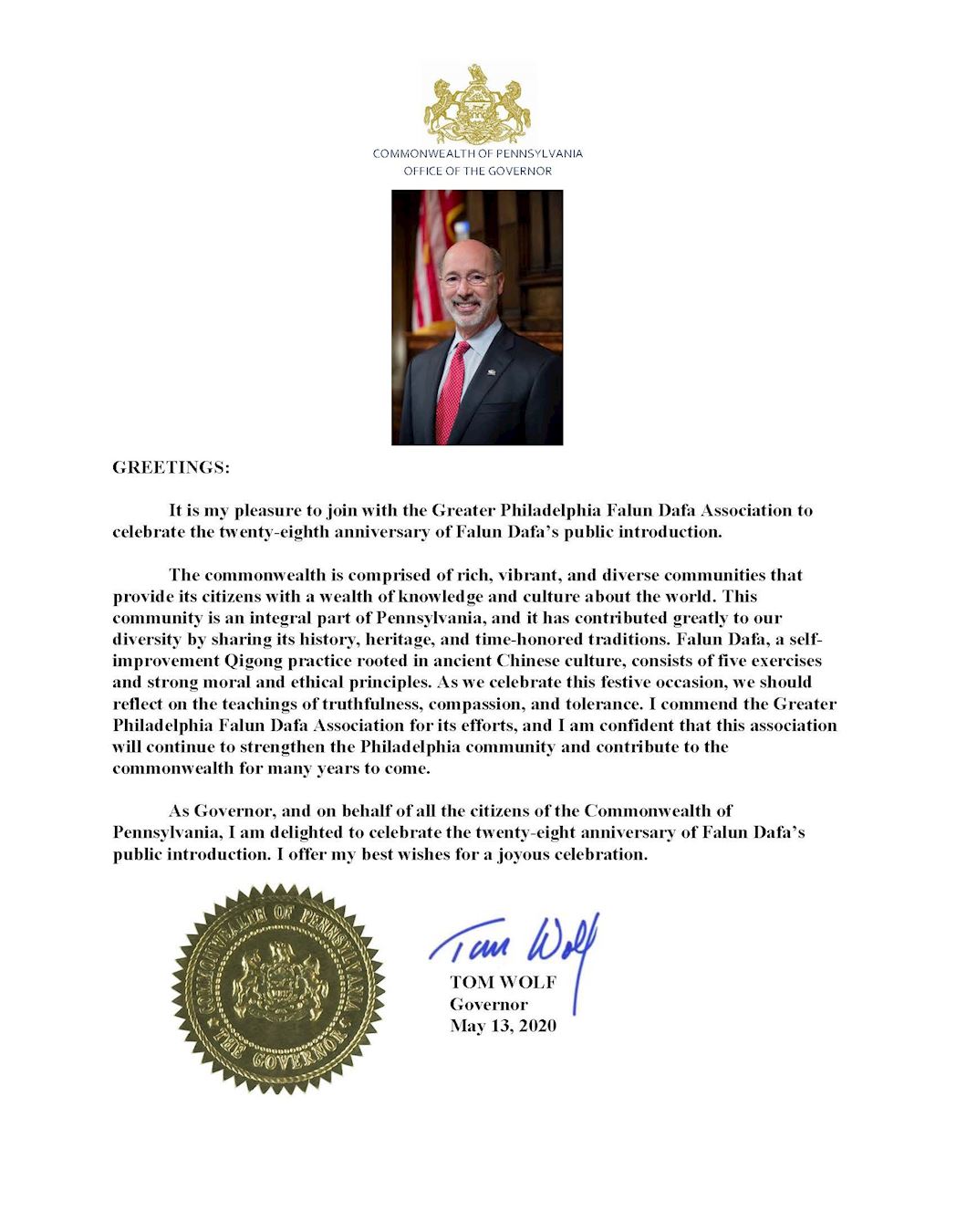 ![]() 图5:宾州州长沃夫(Tom Wolf)庆祝法轮大法弘传世界第28周年的贺信 |