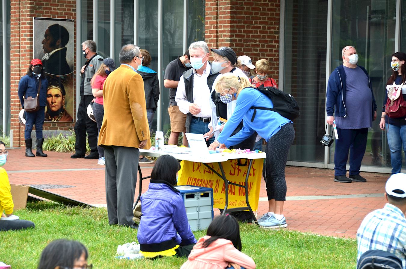 许多游客被学员们祥和的炼功场面所打动。不少人主动前来询问,并在了解真相后签名呼吁停止迫害。来自弗吉尼亚的马塞拉(Marcella)表示,她通过这场疫情了解了中共的罪恶、包括镇压法轮功中的残暴。她表示所有人都应该站出来制止虐杀,因为“做好人没有错!”