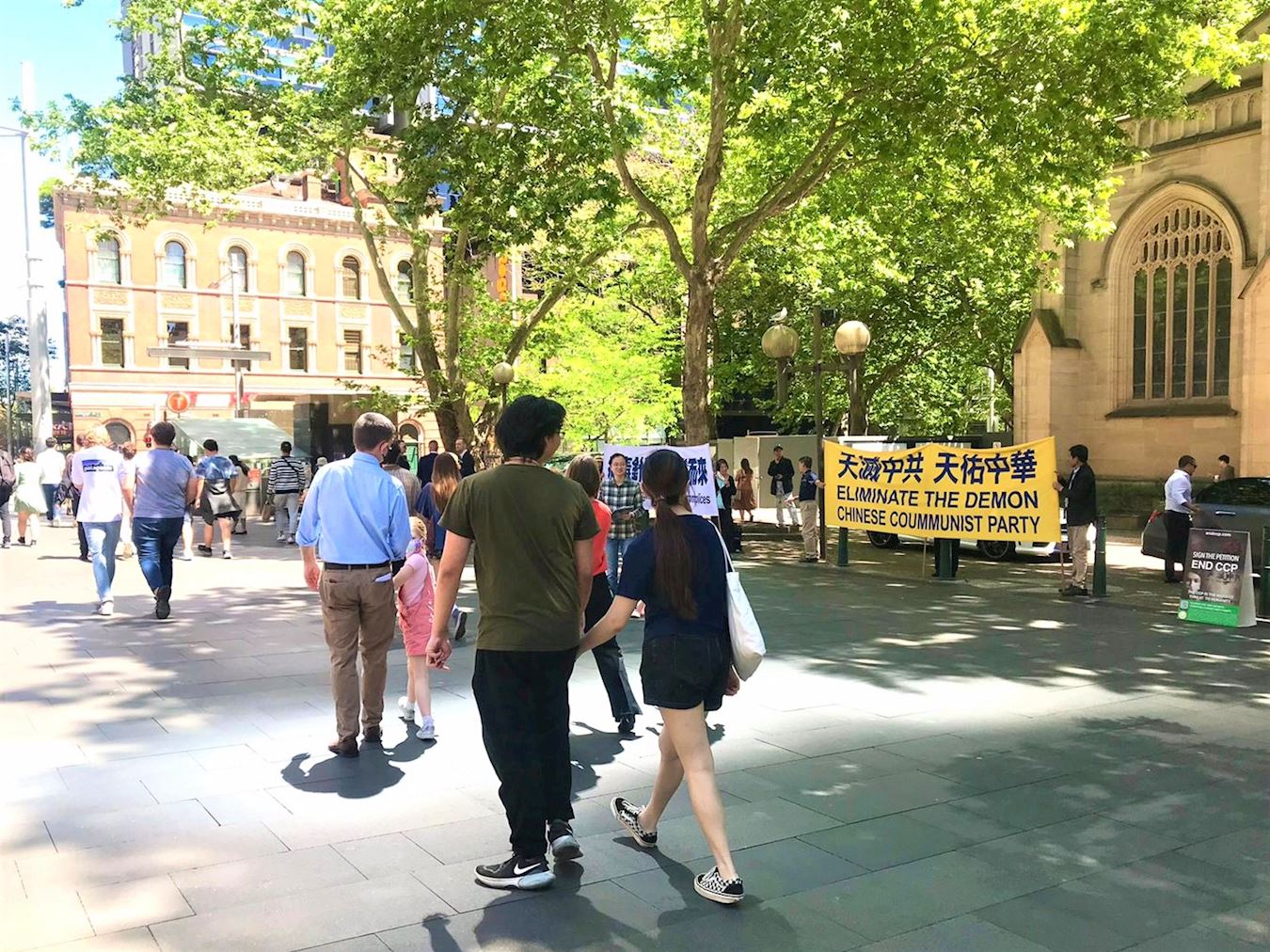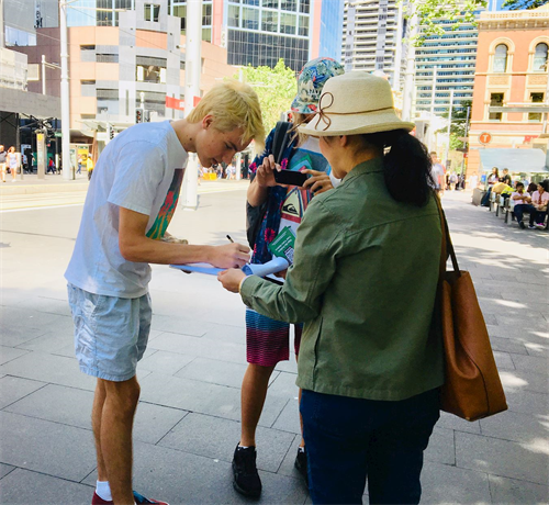 一位华人模样的男士来到活动的信息台,他说他不是在中国出生的,他只会说一点点中文。他从事法律与政治方面的工作,之前他在悉尼街上看到过类似的活动,接过派发的资料,所以他对中共有所了解。