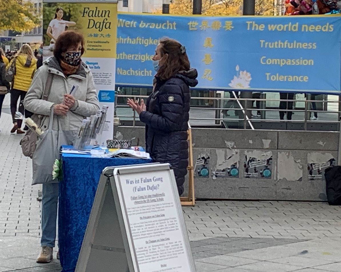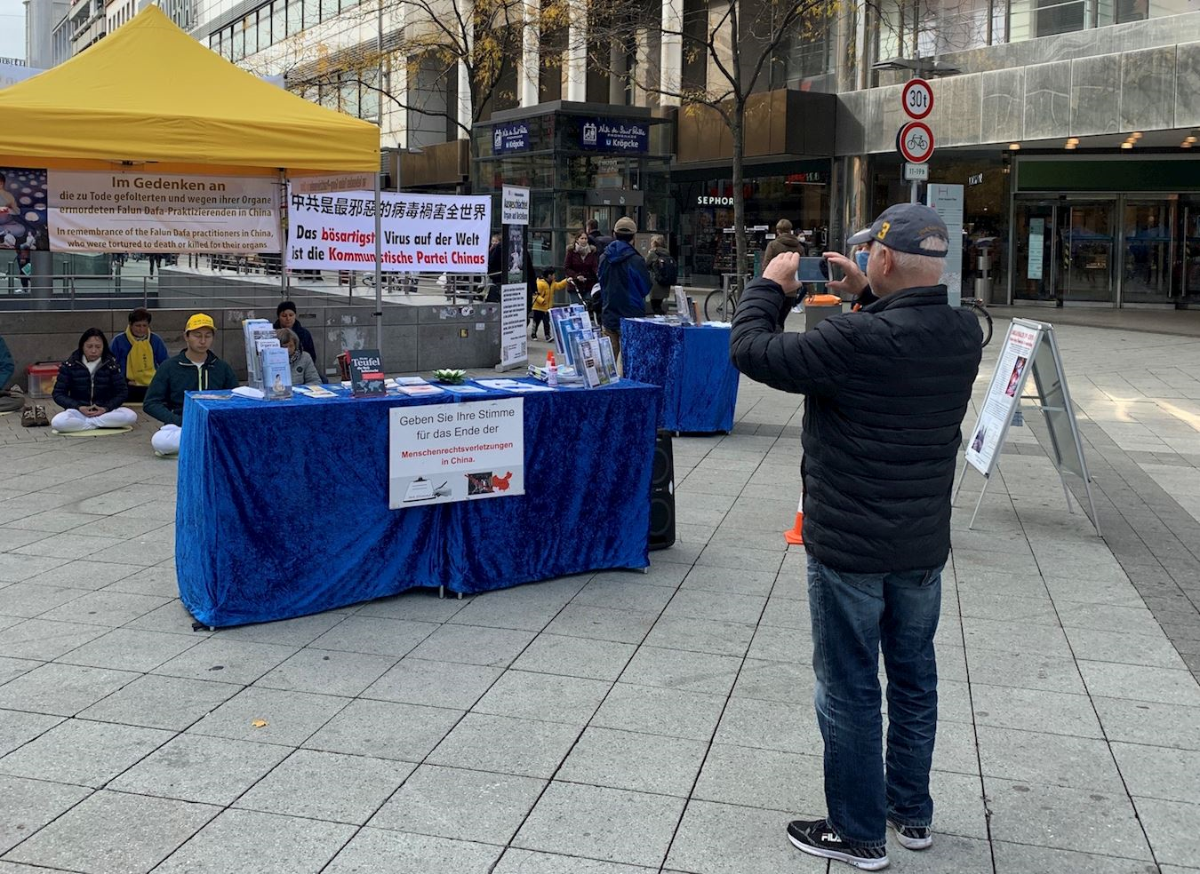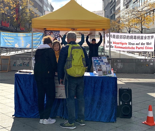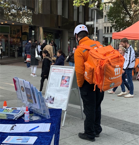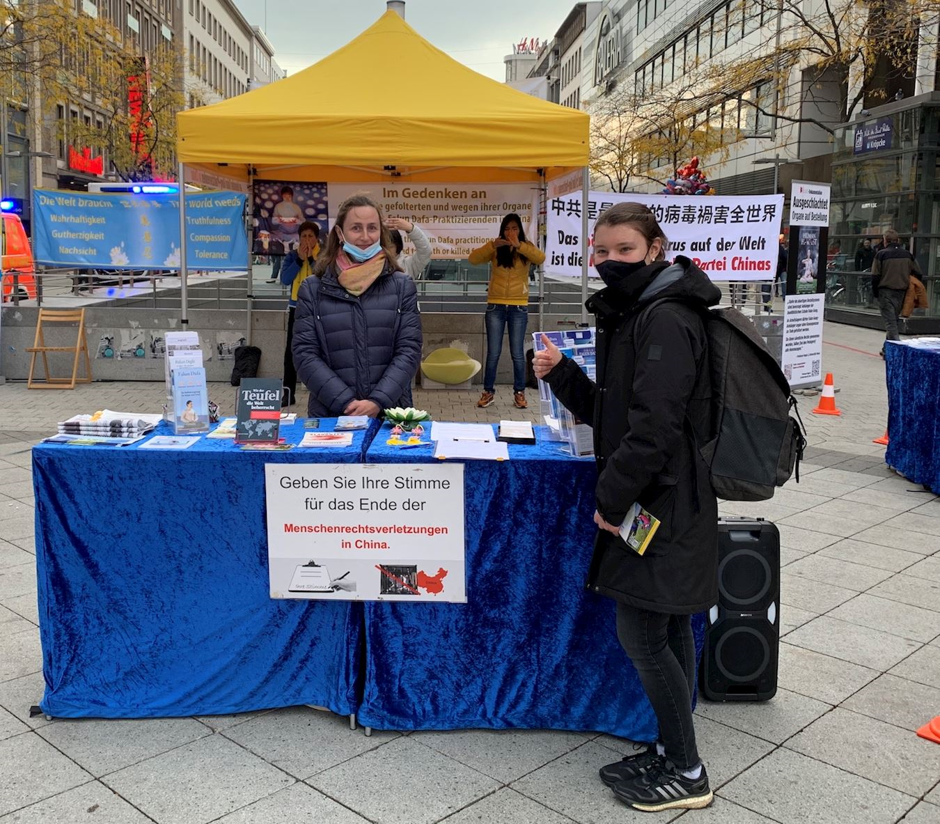 一名在不伦瑞克读书的中国学生对学员表示,他小时候受过中共的洗脑,出来后了解了(法轮功)真相,觉得自己上当受骗了。他退出了曾经加入过的团员,临走前他还上前拥抱了给他讲真相的法轮功学员,并给学员送上了祝福。