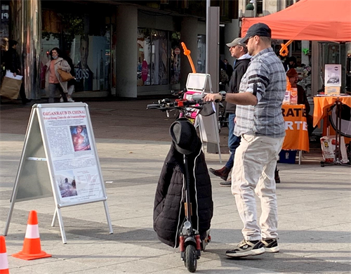 史卡(Shaker)来自伊拉克,是一位在希尔德斯海姆读社会工作(Soziale Arbeit)的大学生。他赞扬法轮功学员,认为学员在这里征签反对中共活摘器官的事情是了不起的行为。他希望他的签名可以为制止这件事作出贡献。他对学员表示,他认为中国(以前)是一个很有智慧的民族,文明和文化都处在一个很高的水准。史卡希望中共的势力可以被削弱,让中国的老百姓可以获得更多自由。他说:“希望有一天中国政府(中共)会垮台,还老百姓自由。”