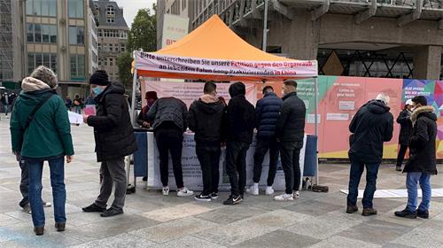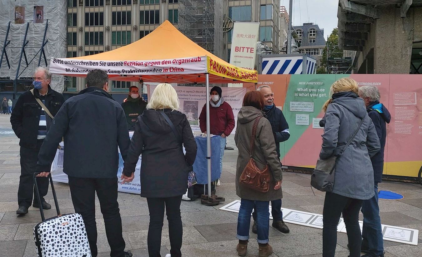 一位50岁左右、住在科隆的女士,和学员交谈了大约一个小时。她曾经在菲律宾待了20多年,积极参与过人权活动,深知中共通过经济施压来影响菲律宾。她之前不曾了解法轮功。在明真相后,她觉得不仅西方国家应该反对中共迫害法轮功,而且中国大陆也应该有所行动,关键在于如何将这些信息传递到中国去。如果中国大陆更多的医生和护士们能知道活摘器官真相,那么可能会在中国的百姓中为此呐喊。