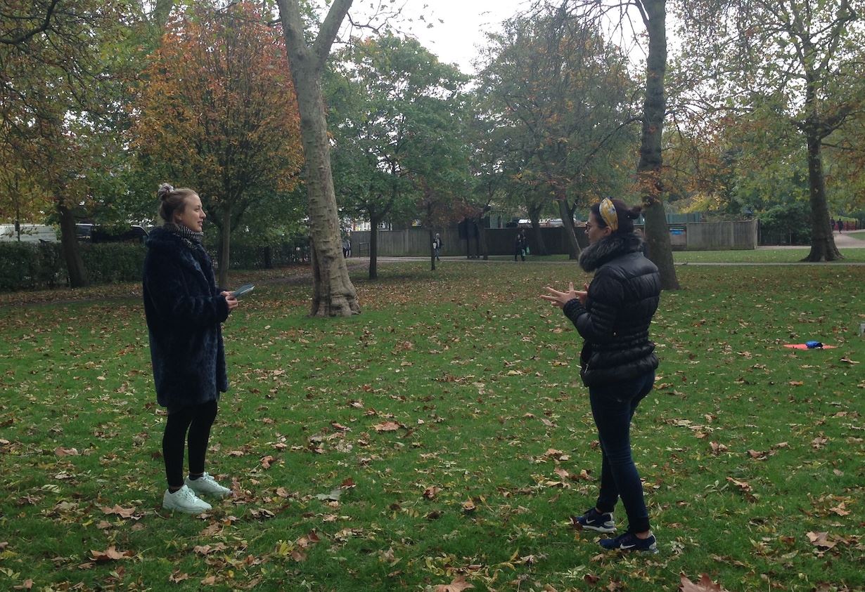![]() 图1:二零二零年十月十八日,法轮功学员卡瑞娜(Carina)在伦敦女王公园(Queen's Park)炼功打坐后与不期而遇的瑜伽老师珍妮(Jenny,左)轻松交谈 |