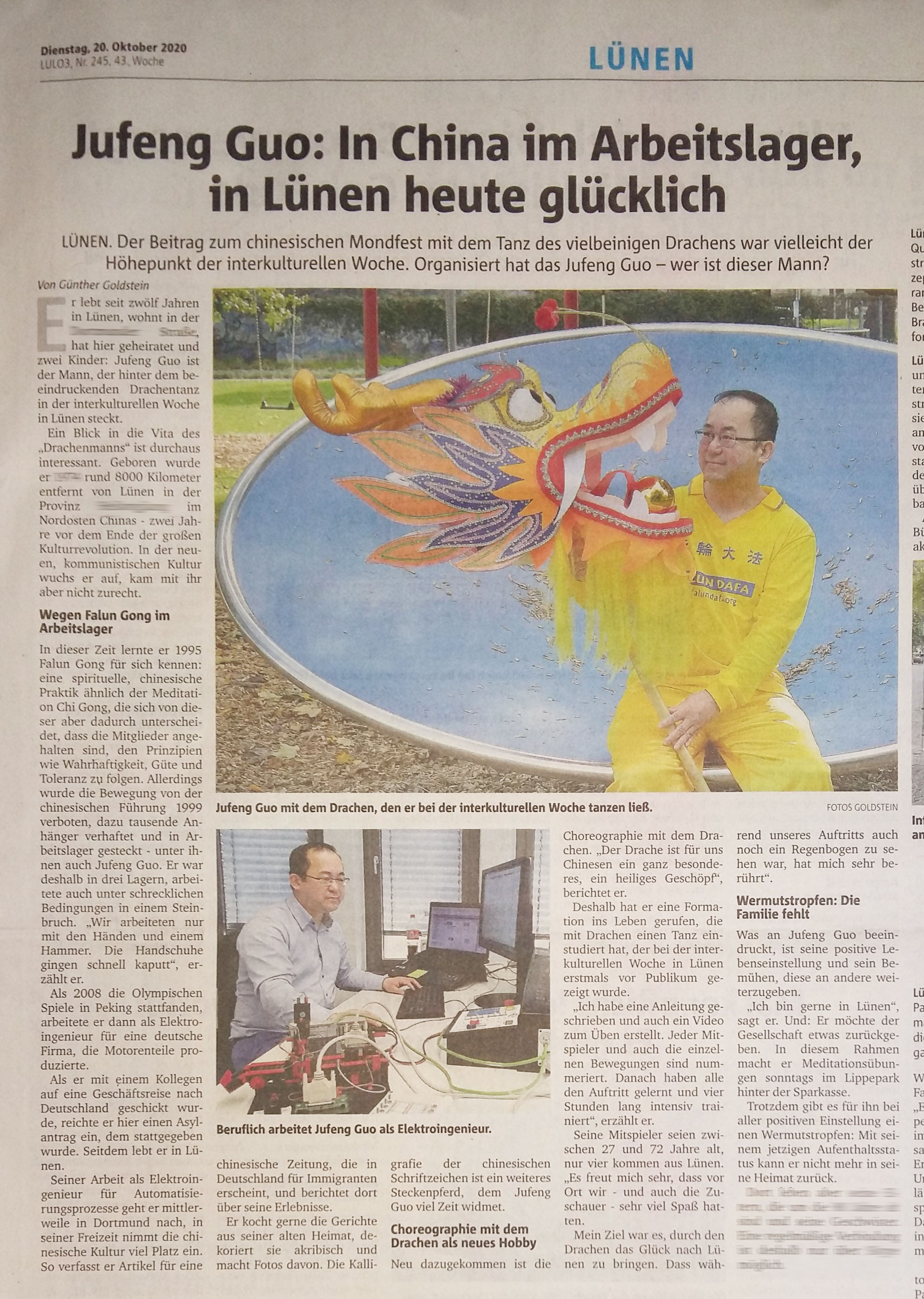 《鲁尔日报》在报道中说:在国际文化周的舞龙让人印象深刻,郭居峰居住在德国已经十二年了,他是隐藏在龙背后的“龙人”。他的家乡在八千公里外的中国东北,他在文革后期出生,但是长大后,他却和社会有些“格格不入”。