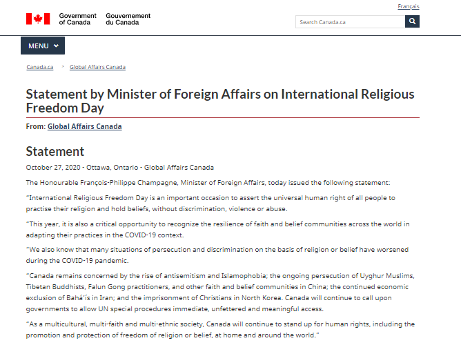 声明强调,“作为一个多文化、多信仰和多族裔的社会,加拿大将继续支持人权,包括在国内和世界各地,促进和保护宗教或信仰自由。”