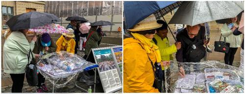 两人听得很专注,他们为法轮功学员二十一年来坚持揭露中共邪恶的勇气所感动。尽管那位男士的头发、上衣都淋湿了,但他还是很开心。临走时他说:“请帮忙把塑料布撩开吧,我们也要签这个名、为的是在这里发声来支持你们。”