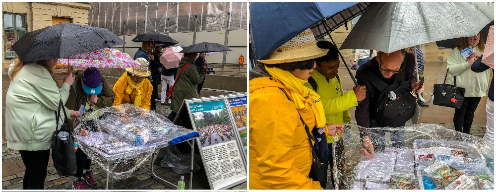 ![]() 图2~3:瑞典民众冒雨驻足了解真相。明白了真相后签名支持法轮功学员反迫害。 |