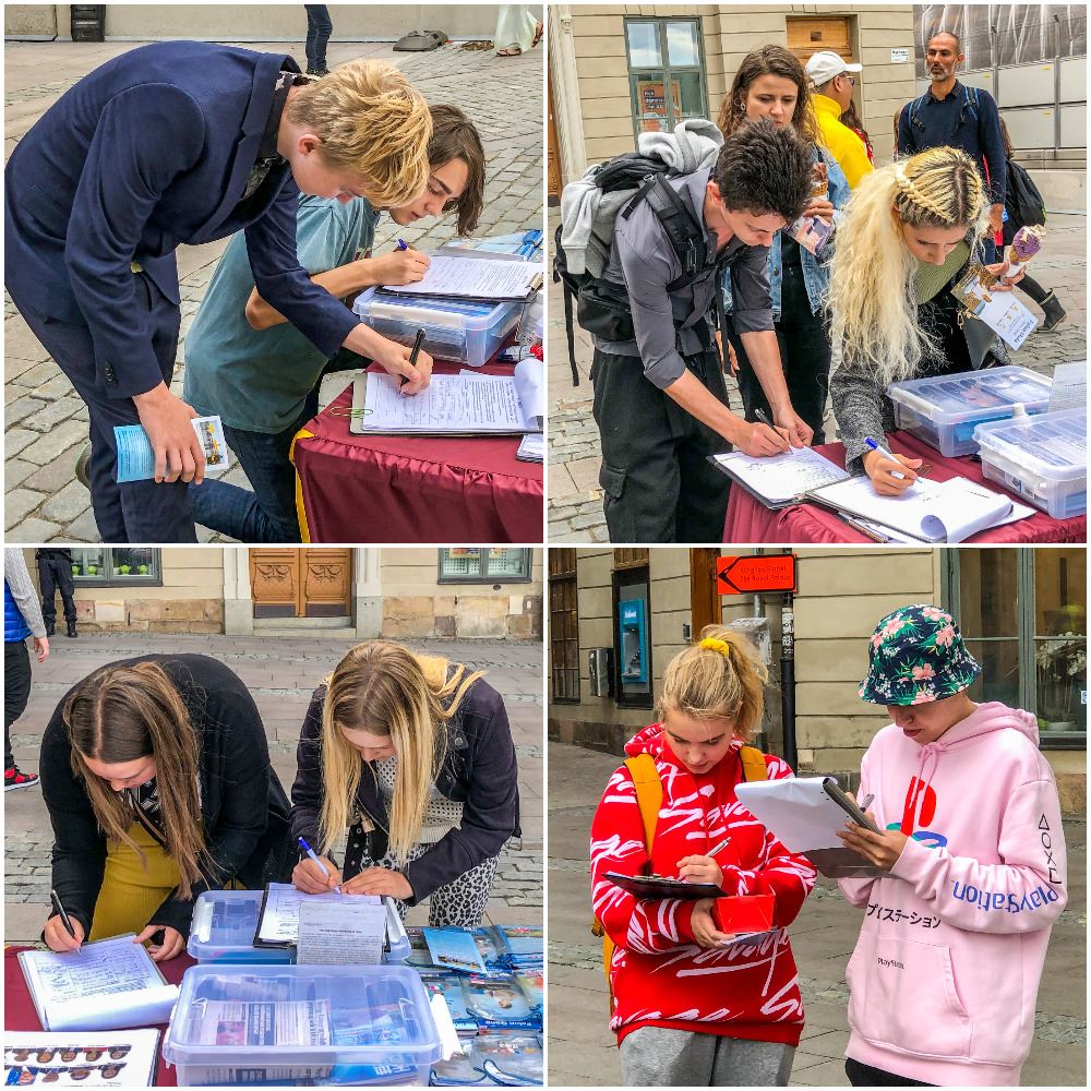 ![]() 图4~6:人们在仔细阅读法轮功真相展板,明白了真相瑞典民众签名支持法轮功学员反迫害 |