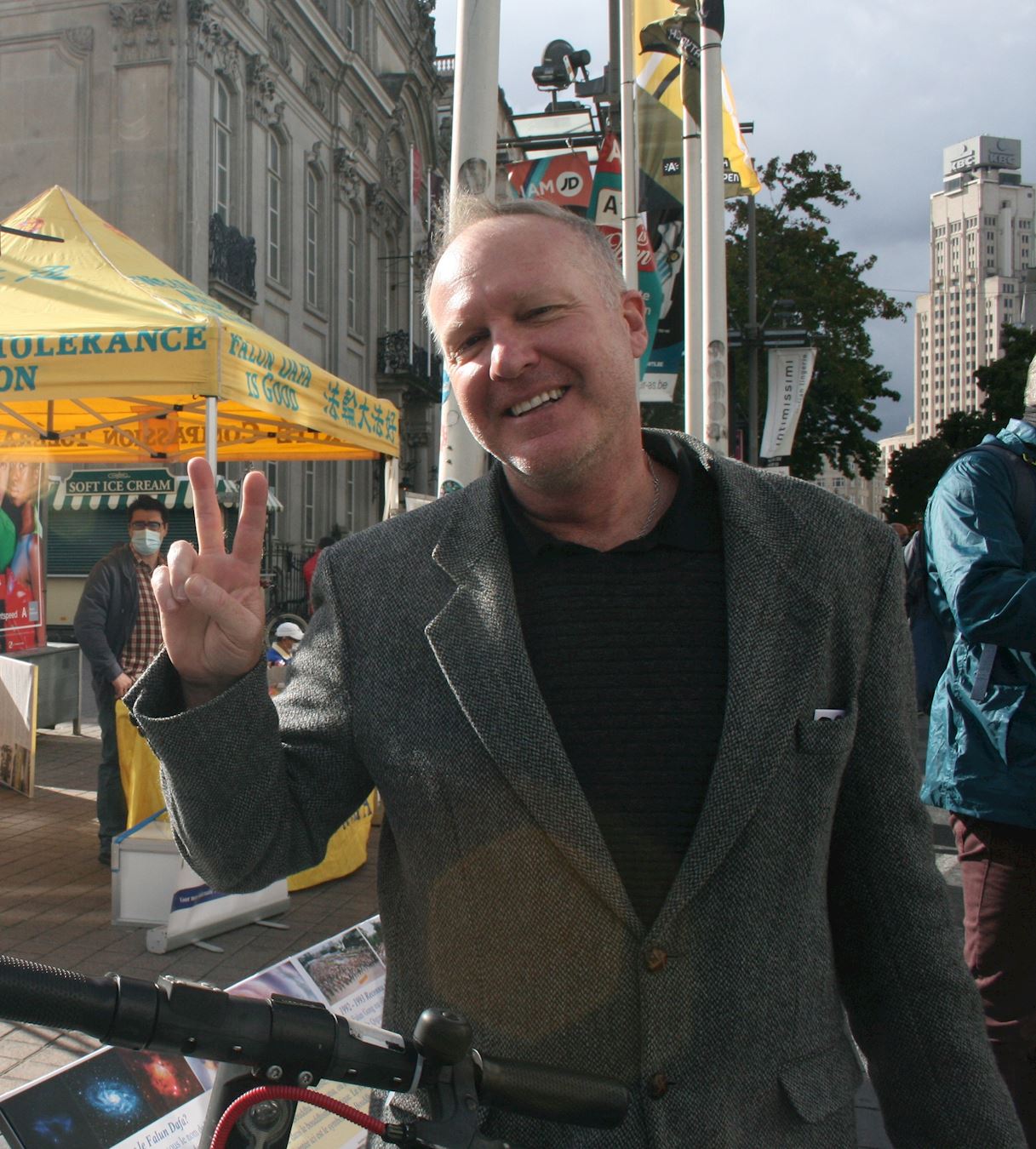 皮特(Peter)和朋友来逛街,看了法轮功真相展板和功法展示,他表达了自己最大愿望就是尽快结束对法轮功的迫害。他说:我了解一些中共活摘器官的情况,有些医院在配合这样的犯罪。我希望这些罪行尽快能结束。因为中国共产党在掌权,所以中国有很大很大的问题,我希望对法轮功的迫害能尽快结束。