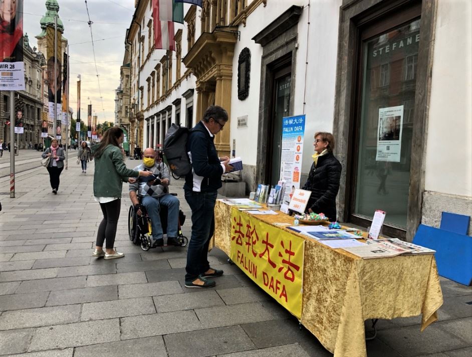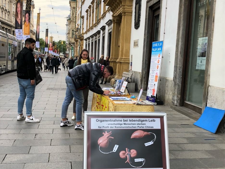 在格拉茨州政府前的绅士街上搭建的真相展台也吸引了很多行人。一对来自德国的夫妻说:“你们做的事值得尊敬。”他们认识到中国对好人的残酷迫害就是应该被揭露的重要性。