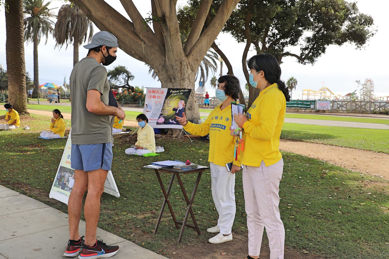 一位住在圣莫妮卡海滩附近的男士告诉学员,自己是早年从英国移民来美的,他经常看到法轮功学员在这里炼功,对法轮功有深刻的印象。他还告诉学员,他知道中共在中国迫害法轮功学员,活摘学员器官的罪行。他说:“我叫我的朋友们不要买中国制造的东西,因为中共迫害法轮功。”他还经常在社交媒体上反驳五毛的错误言论。他也签了“打倒中共恶魔”。