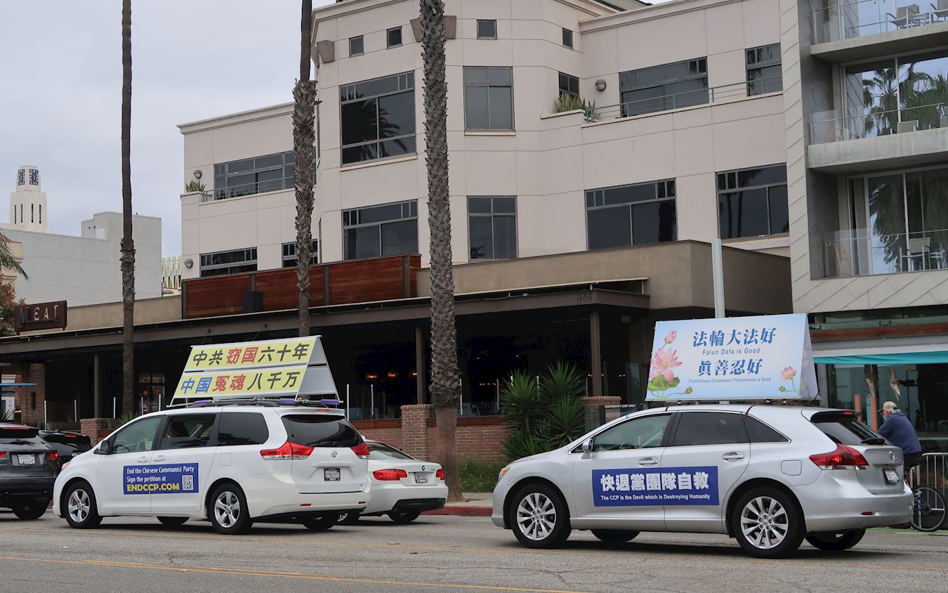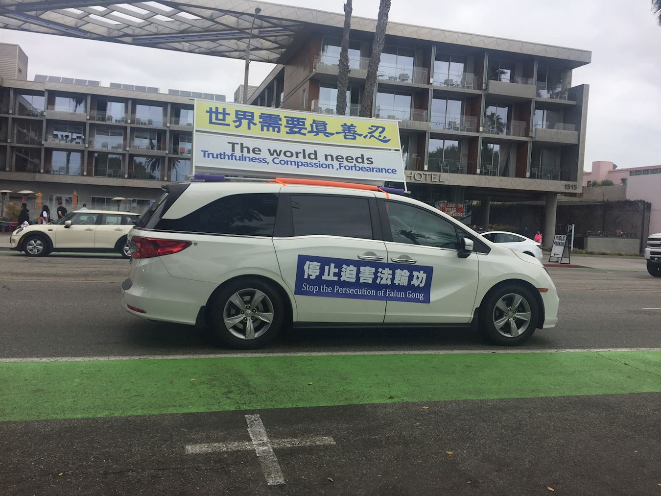 !党!团队自保”等信息,希望人们远离中共得到平安。'>图5~8:二零二零年十月二十五日,由法轮功学员组成的真相车队也来到圣塔莫妮卡海滩附近,车顶上的中英文广告牌向人们传达“法轮大法好”(Falun Dafa is Good,)“真善忍好”、“打倒中共恶魔”(Eliminate The Demon CCP)、“快退!党!团队自保”等信息,希望人们远离中共得到平安。 |