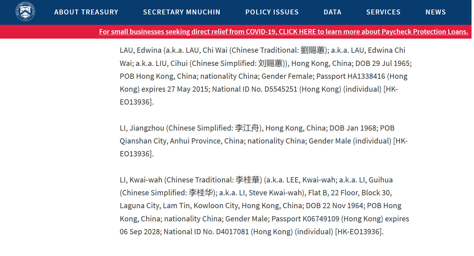 美国财政部网站在《美国特别指定国民和被封锁人员》最新名单中,列出四人的中英文姓名、住址、身份证明文件号码、护照号码等资料。