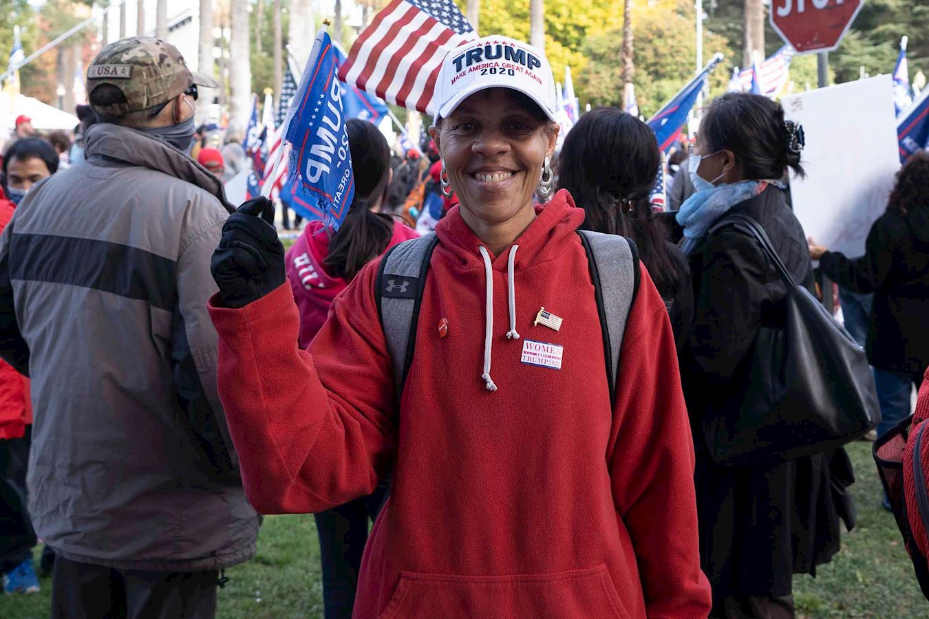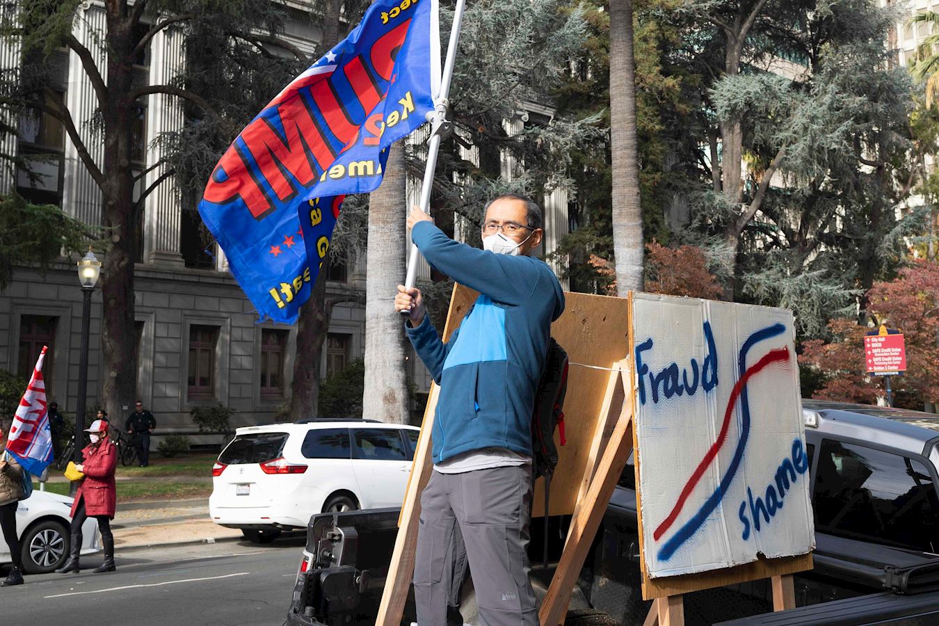 从南加州尔湾(Irwan)市开车五个小时赶来支持川普的于先生站在车上,不断挥舞着支持川普的大旗子。“我反对选举舞弊,他们想偷走我的国家。如果他们得逞,美国就会变成共产主义的中国。”