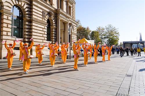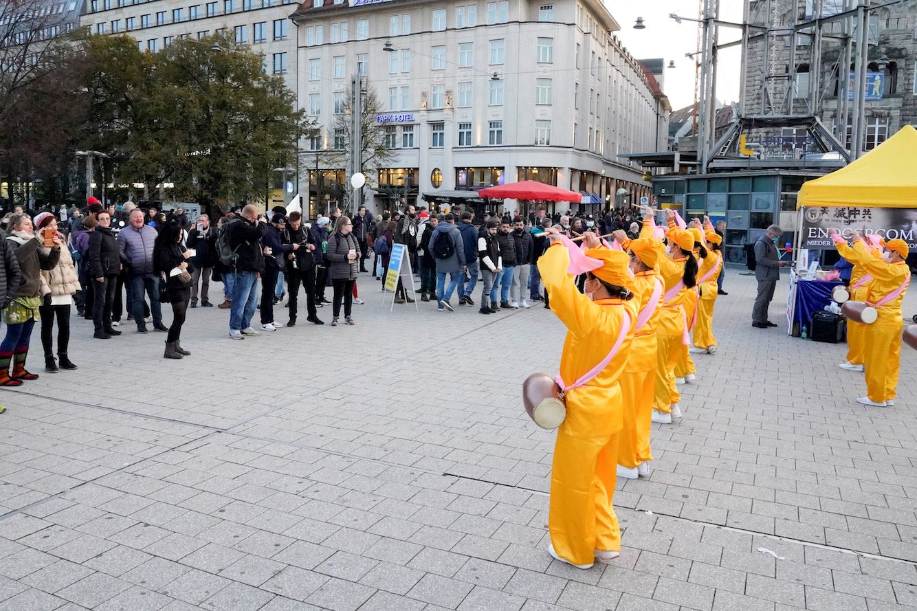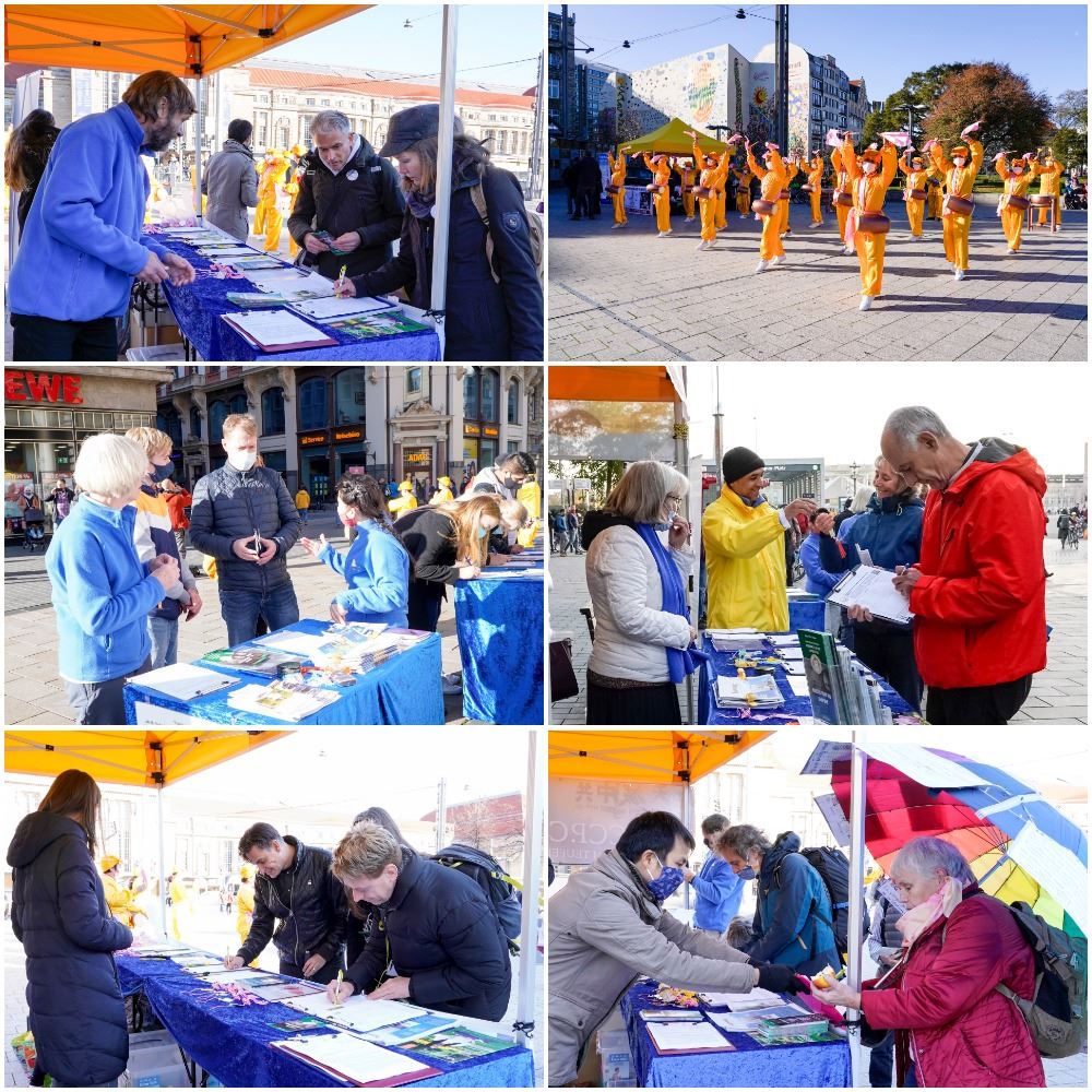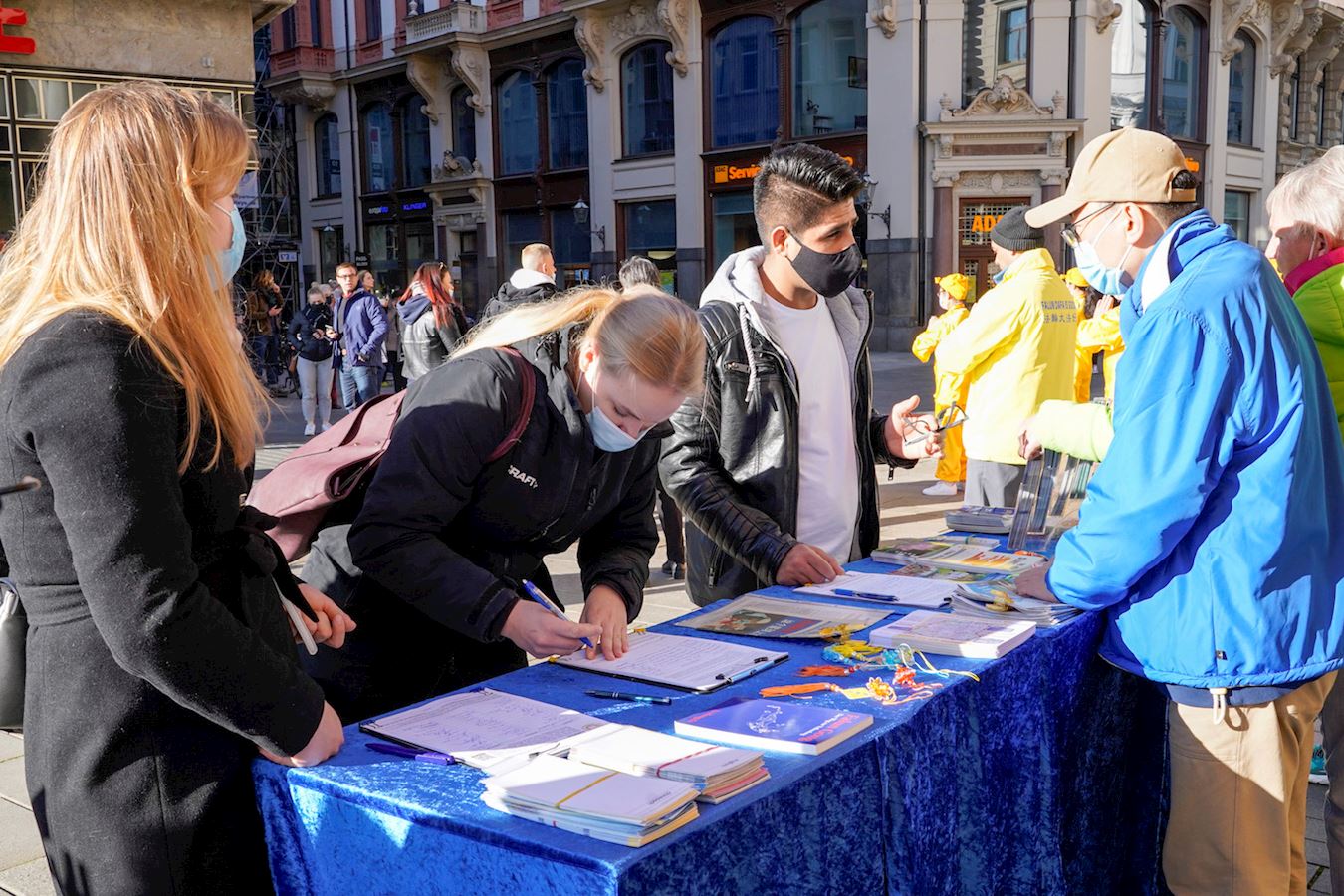 法轮功学员腰鼓队的表演吸引了人们的目光,人们被学员亮丽的服饰、潇洒的动作、愉悦的表情吸引。不少民众上前跟法轮功学员交谈,了解什么是法轮功,为什么中共要迫害法轮功,中共活摘器官是怎么回事,为什么要终结中共恶魔。人们了解到法轮功修炼真、善、忍,跟中共宣扬的假恶暴正相反,了解真相后的民众,纷纷在制止中共迫害法轮功和“解体中共恶魔”等签名簿上签名。