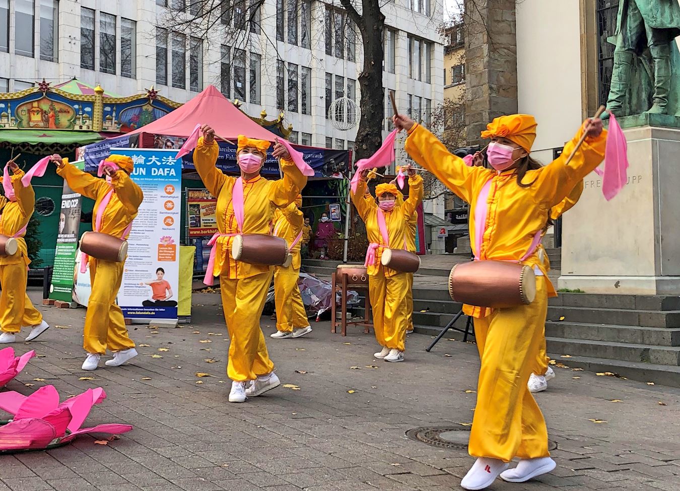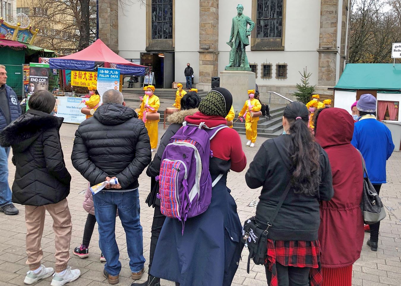 一位三十岁左右的中国人被腰鼓队的表演吸引,前来观看。他跟学员说,自己知道中共对法轮功的迫害。学员们跟他讲了法轮功“真、善、忍”的准则和中共的邪恶,并告诉他“三:退.保平安”。听了学员的解说后,这位来德国打工的中国男士宣布要退出中共的党、团、队。临走时,他记下了学员的联系方式,表示要跟他的朋友说三:退.的事,也希望学员能帮助他们三:退.。