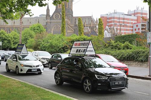 二零二零年十一月二十二日,数十位墨尔本的中、西方和越裔法轮功学员以汽车游行的方式传递真相。他们在自己的车顶上架上醒目的中英文标语牌:“法轮大法好”、“真善忍好”、“法轮大法洪传世界”、“天灭中共、天佑中华”、“Say NO to the CCP”(向中共说不)、“CCP Lies,People Die”(中共撒谎,人民死亡)、“End the Evil CCP”(解体中共邪*党-)、“抛弃中共,退!党!是福”、“中共不等于中国”、“三:退.保平安,瘟疫不沾边”、“中共是邪恶病毒祸害全世界”等,呼吁澳洲民众认清真相、拒绝、抵制中共。有民众在市中心观看了汽车游行后表示,钦佩法轮功学员付出的努力,认为活动很有意义,法轮功学员们了不起,让更多澳洲人了解到真相。