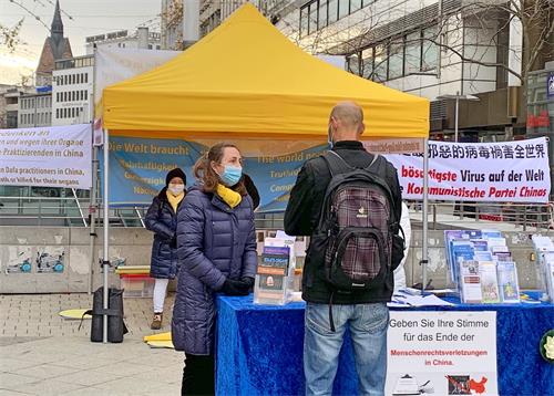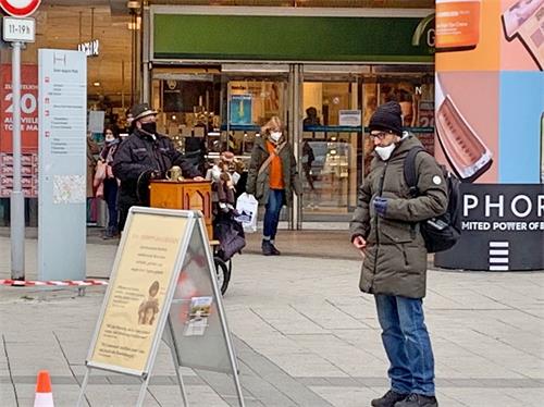 十一月份的德国已是深秋,天气渐渐转冷,尽管如此,许多行人的注意力被吸引到法轮功学员的信息台前。有两位路过真相点展位的中国人。他们看到“中共是最邪恶的病毒祸害全世界”的横幅后,便停下脚步。起初两人有些生气,他们误把中共当成中国。学员跟他们解释,中共不等于中国。并告诉他们中共如何给老百姓洗脑,但人们却意识不到它的危害,老百姓在不知不觉中就被其灌输的思想意识所控制。其中一名女士听完后点了点头,又问到:为什么法轮功学员“自焚”。学员告诉她:二零零一年中共全国范围内、铺天盖地宣传的“天安门自焚”是假的,是中共自编自演诬蔑法轮功的,煽动人们对法轮功的憎恨,已经有国际组织对央视播放的“天安门自焚”事件的录像片放慢分析,看到中共造假的漏洞百出。听着法轮功学员给他们讲出真相,两人的态度缓和下来,最后男士退出了曾经加入过的中共党员组织,女士退出了曾经加入过的团员组织。
