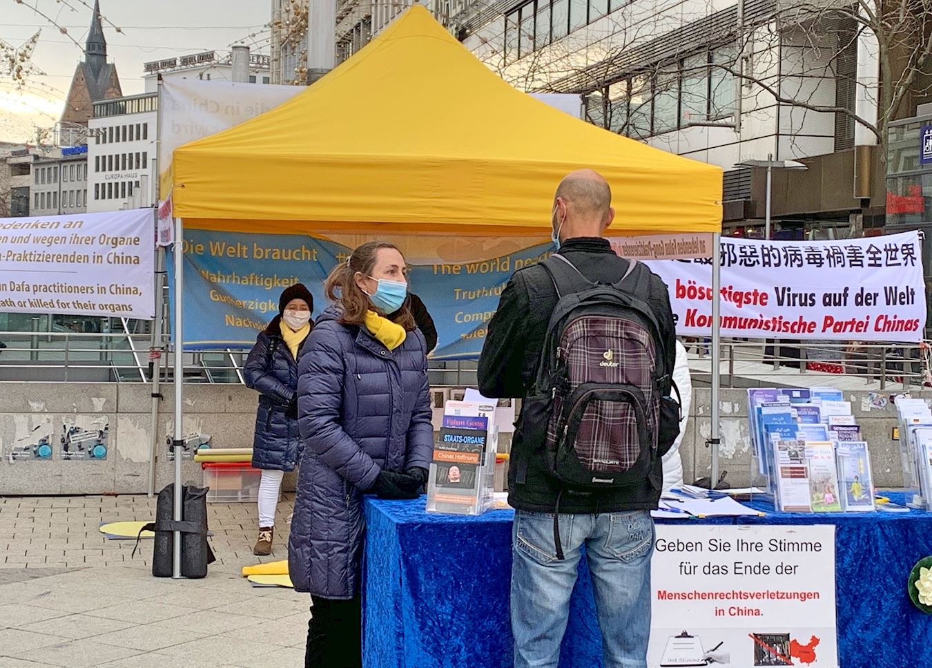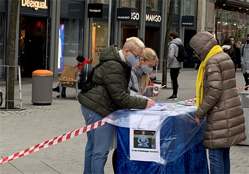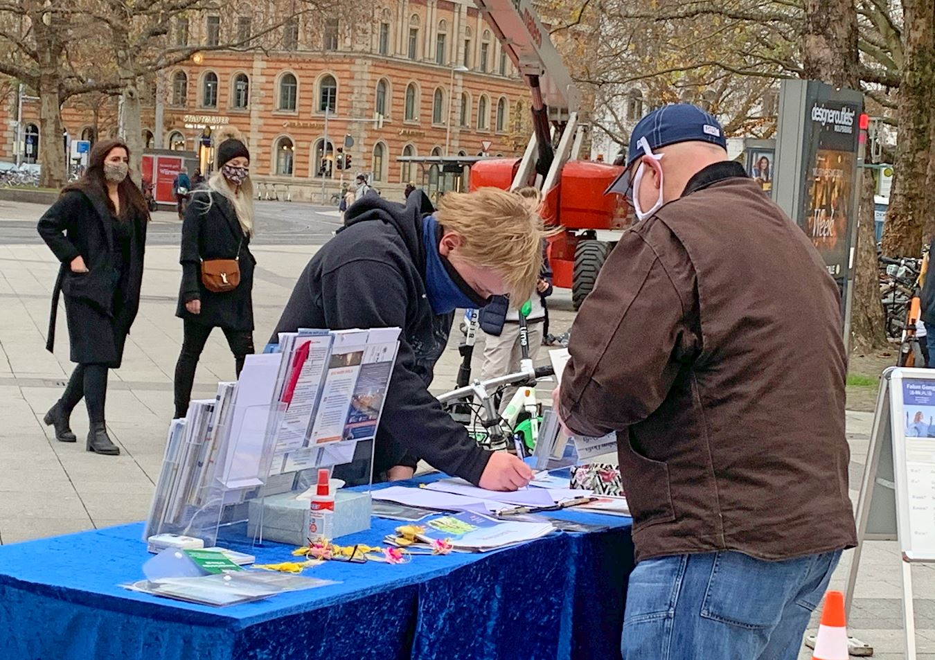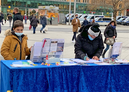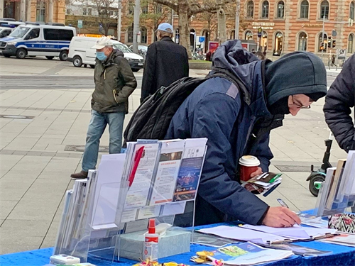 【明慧网二零二零年十一月二十六日】二零二零年十一月二十一日,部份来自德国汉诺威(Hannover)和周边城市的法轮功学员在汉诺威火车站(Hauptbahnhof)对面的邦厚夫街(Bahnhofstraße)举办信息日。此次信息台上不仅有反对中共活摘法轮功学员器官请愿书的征签表,还增加了“解体中共”的征签表。有的行人在两份征签表上都签了名后,还也拿走揭露中共法轮功学员、活摘器官相关信息的真相传单,要回去了解更多。