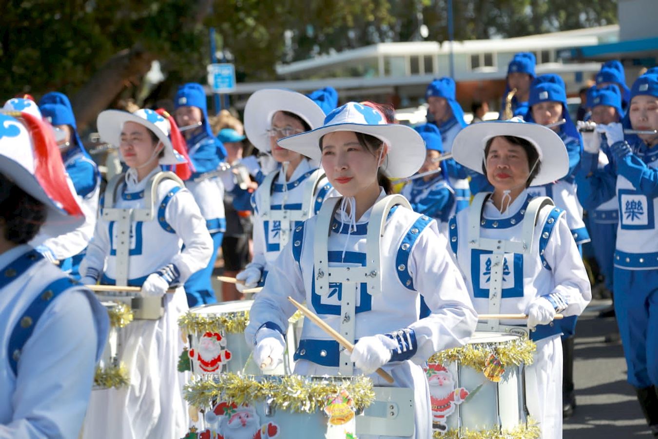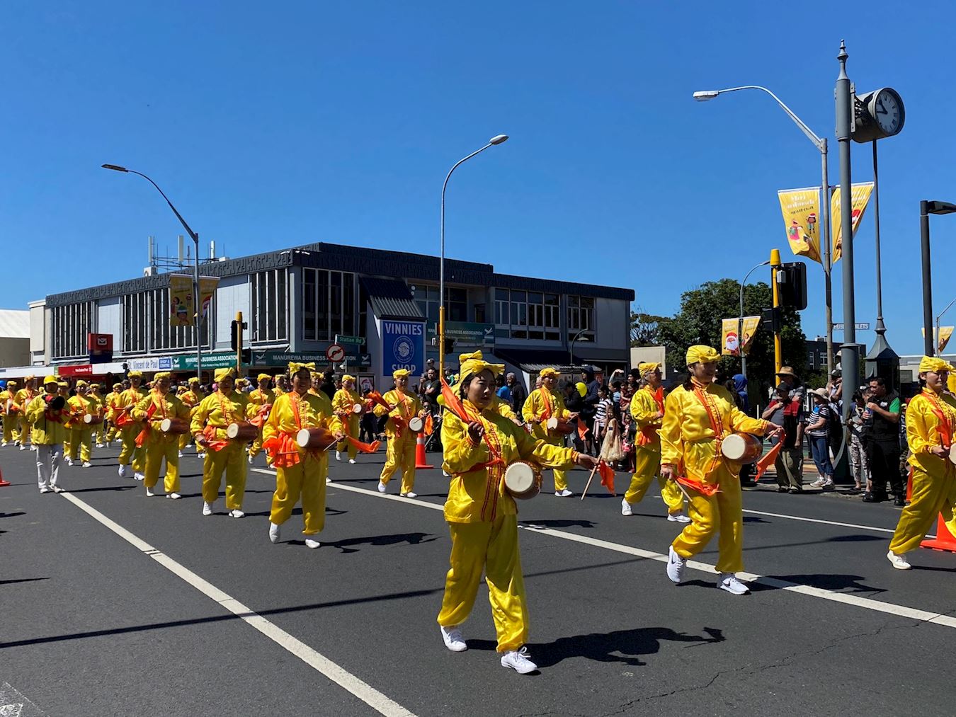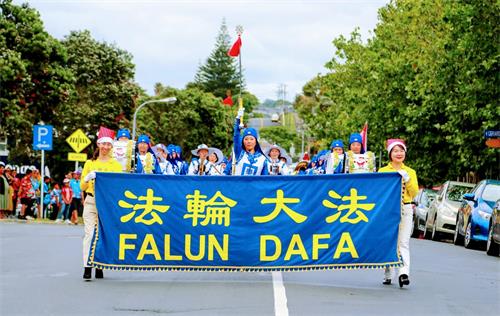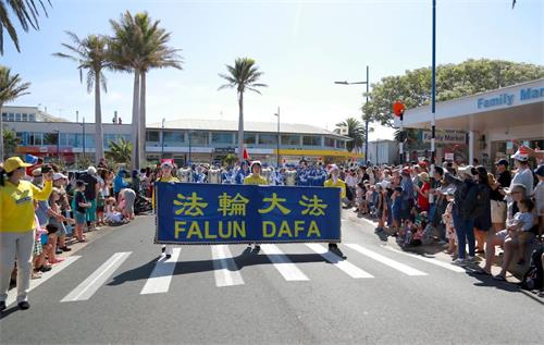 当法轮功队伍出现时,人群爆发最热烈的掌声,只见身着蓝白相间的传统服饰的天国乐团英姿飒爽、乐曲雄壮;腰鼓队和舞龙队的表演让人目不暇接。“法轮大法好”、“世界需要真善忍”的横幅传递着美好的信息。