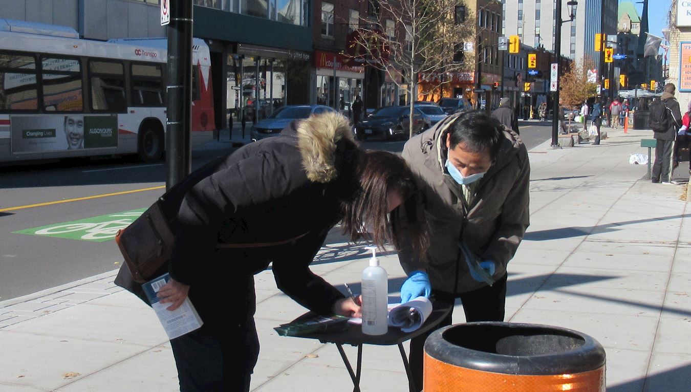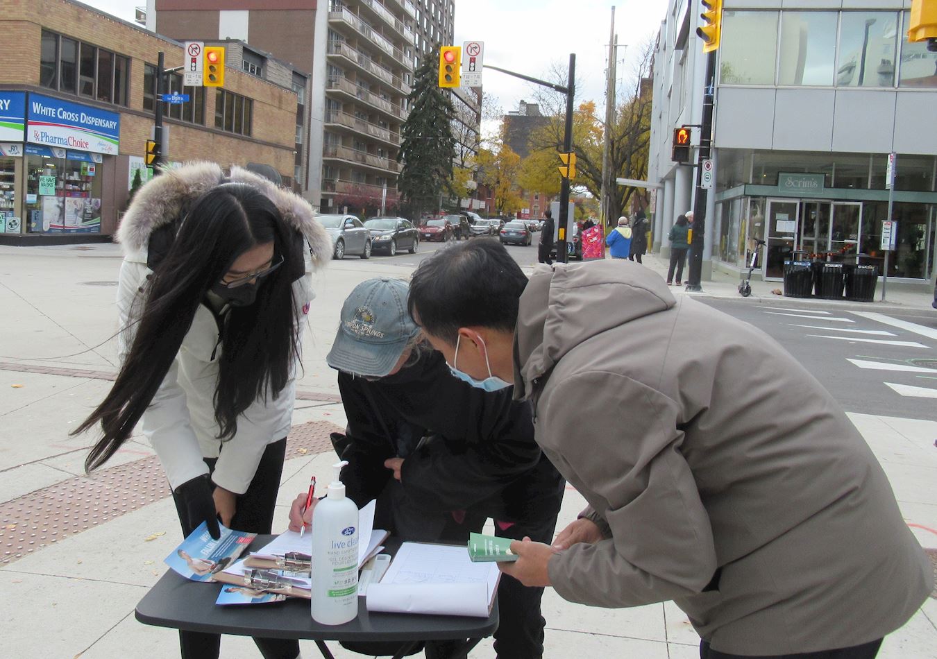 ![]() 图1~3:自十月二十四日,法轮功学员起在渥太华闹市区主要路口举行征签活动。许多市民签名声援法轮功,谴责迫害,并支持解体中共。 |