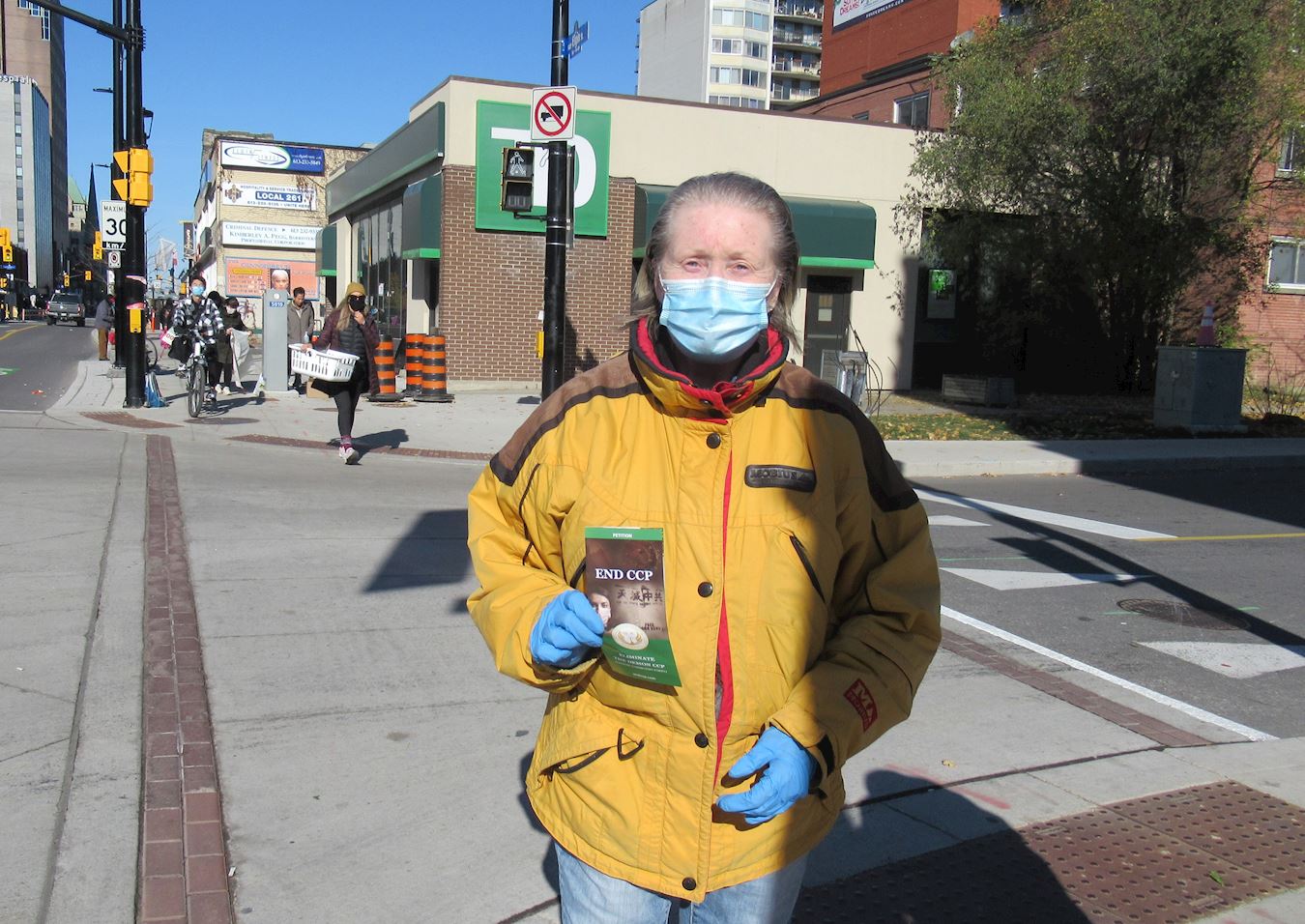 在惠灵顿(Wellington)街上,一位女士在仔细阅读了横幅广告。然后,她签署了请愿书,她说:“我来自波兰。我对共产主义非常了解。”她表示,共产主义思想让人丧失人性。她对法轮功学员的勇气表示赞扬和感谢。