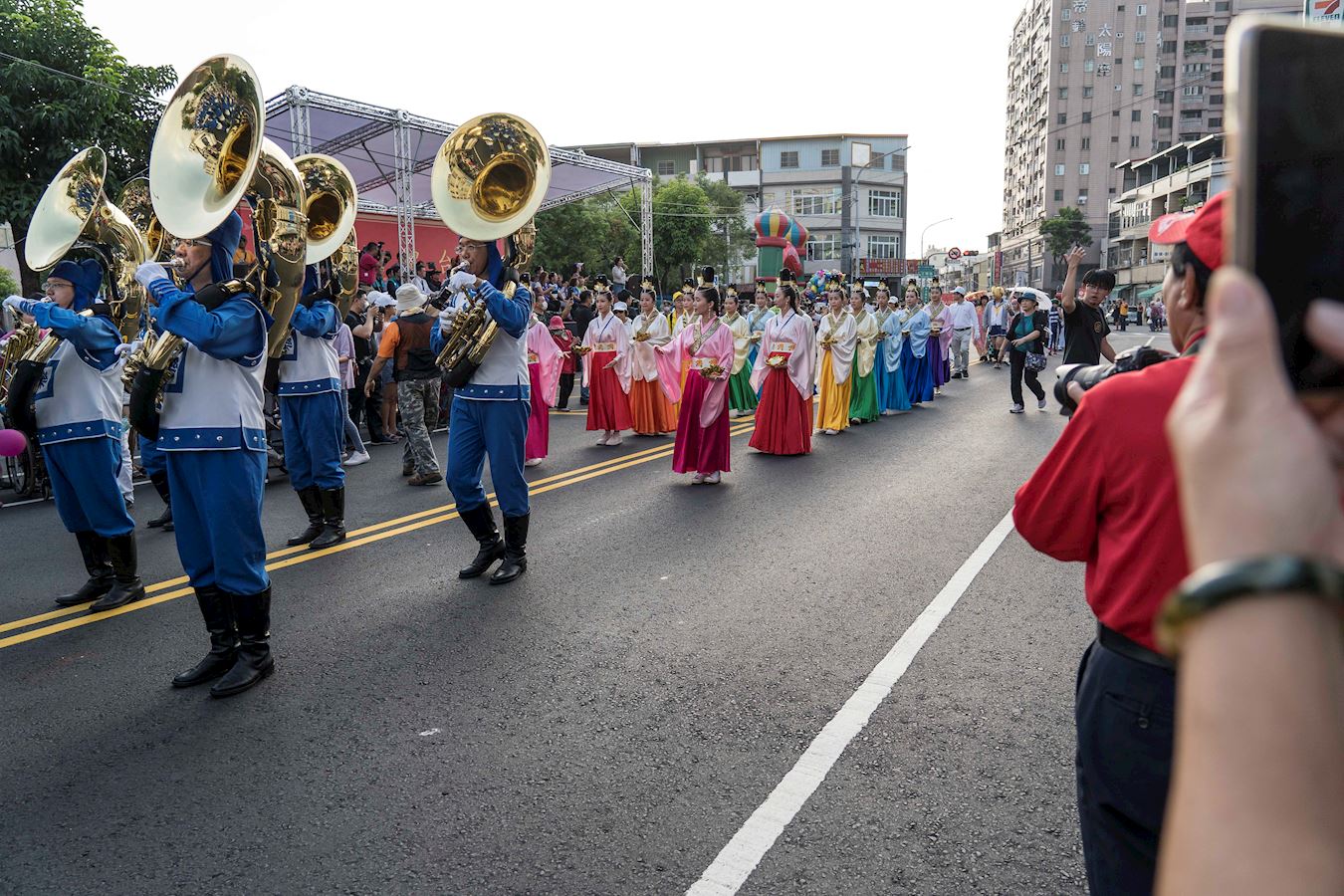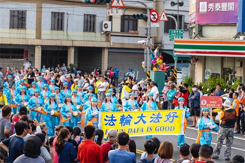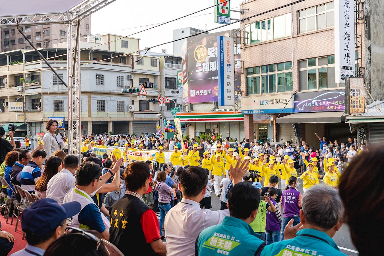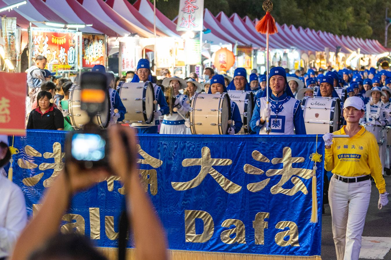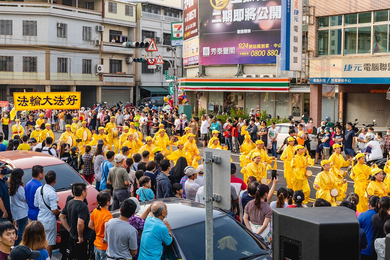 游行队伍浩浩荡荡穿行冈山热闹市街,加上林林总总的各式小吃展位,沿途吸引满满的民众观看,或跟着队伍走、或拿手机拍照留念,对法轮功赞不绝口。