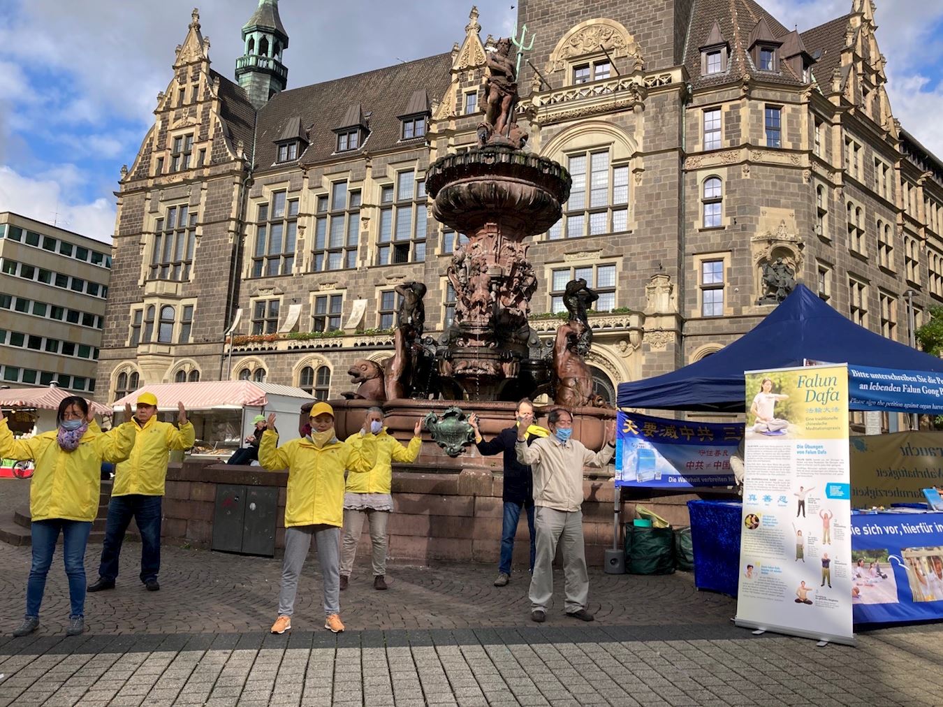 法轮功学员从二零二零年九月底开始,几乎每个周末都在伍伯塔尔市(Wuppertal)中心的广场上举办信息日。十月三十一日,学员们又一次来到市中心的喷泉旁边。