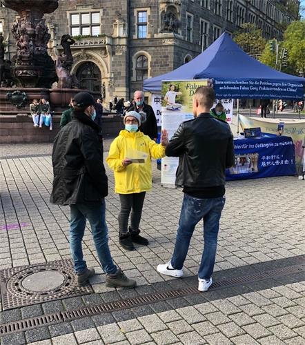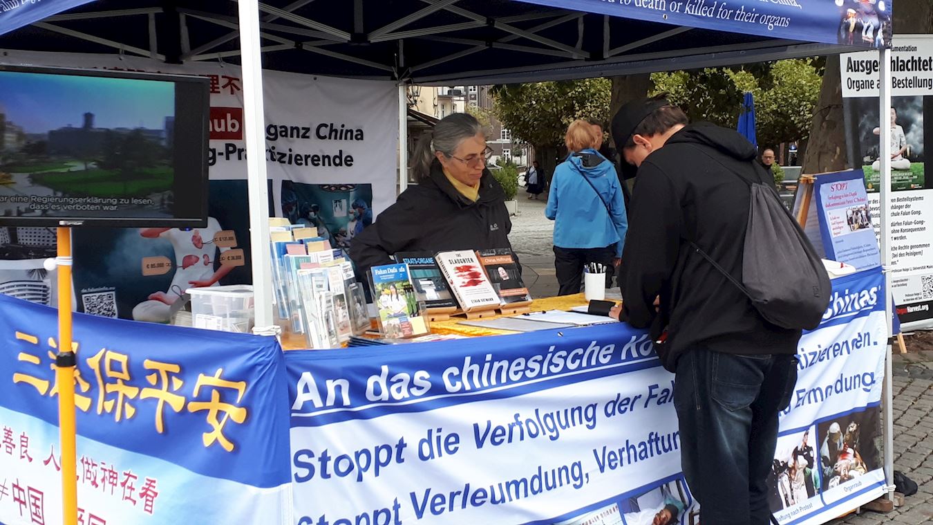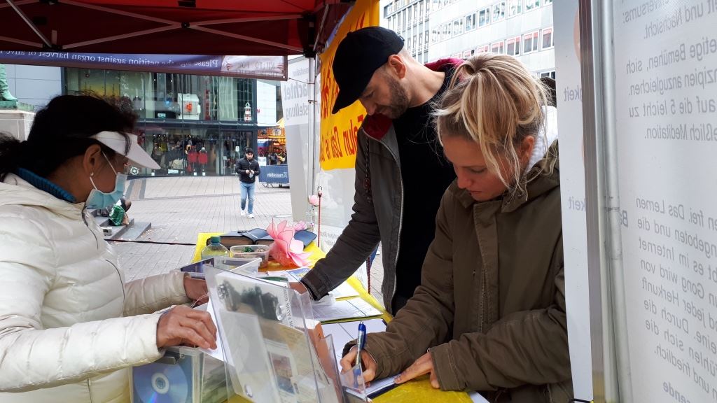 埃森市(Essen)的真相点坚持很多年了。法轮功学员定期到市中心步行街,人流聚集的地方讲真相。十月份,学员们又多次来到这里。不时有民众主动来了解真相,并为反迫害签名。