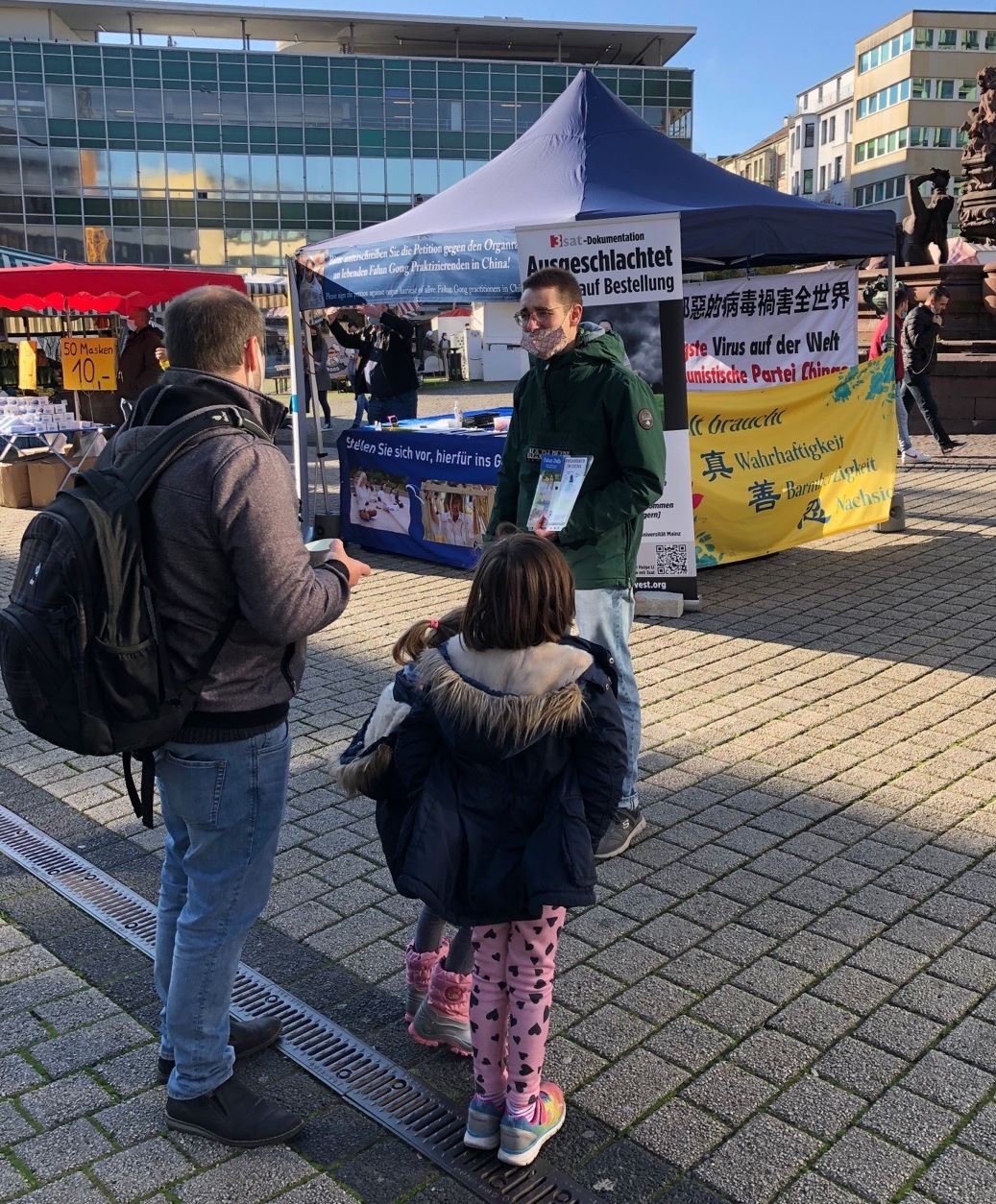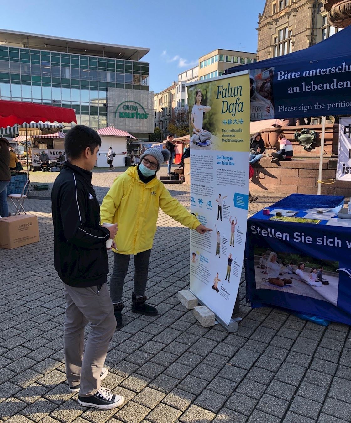 这是德国十一月起半封城之前的最后一个周末,街上人们虽然和往常一样购物,可是能看到不少人都很小心地保持社交距离。炼功音乐响起后,不时有行人驻足观看功法演示,也有人主动上前向法轮功学员了解真相。很多人为反迫害签了名。