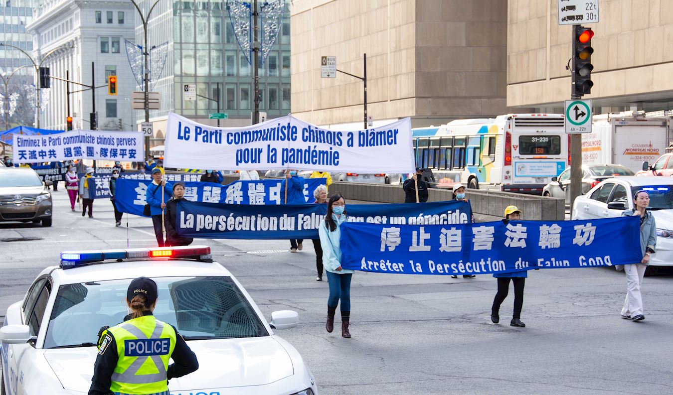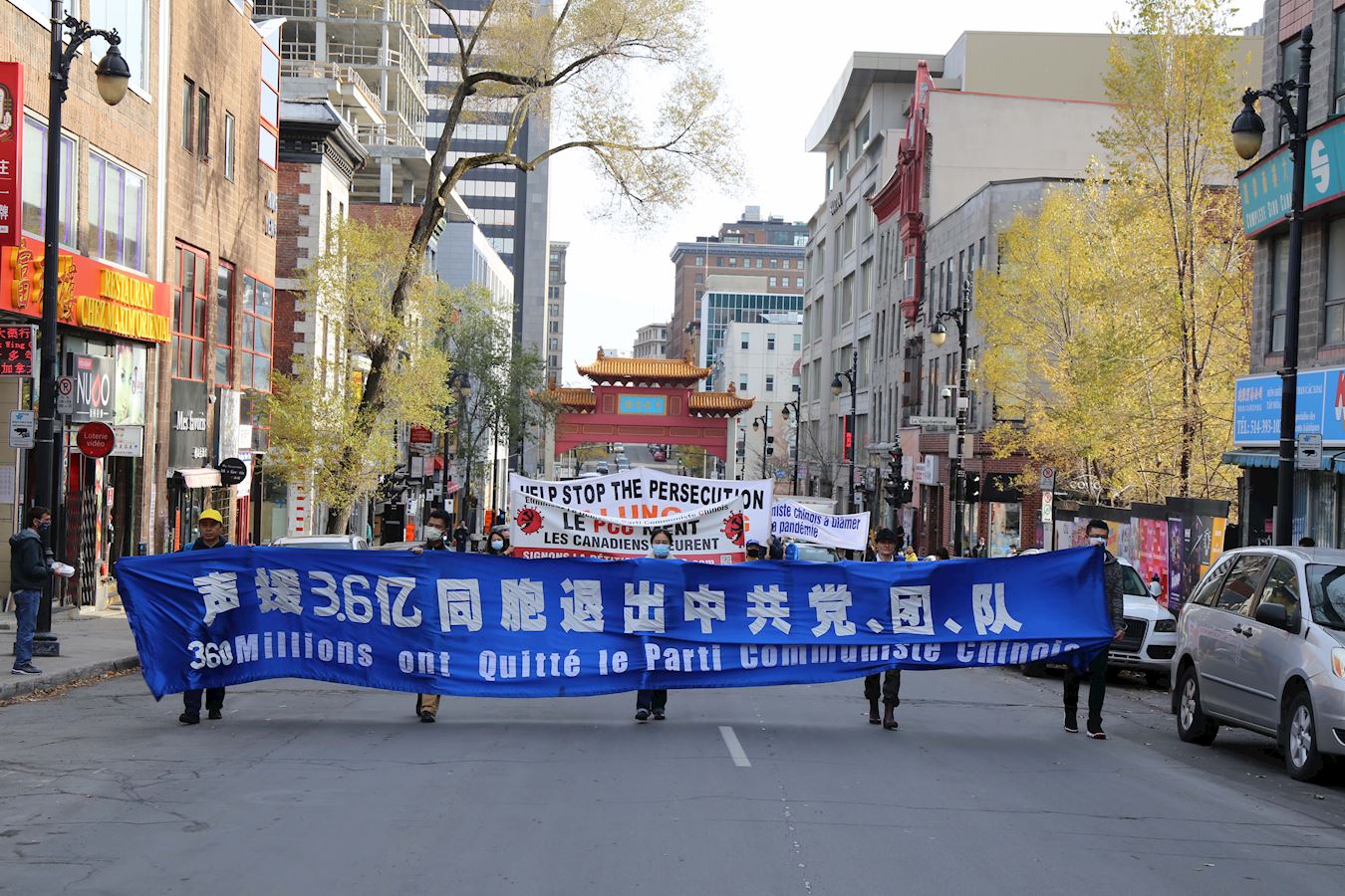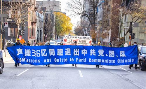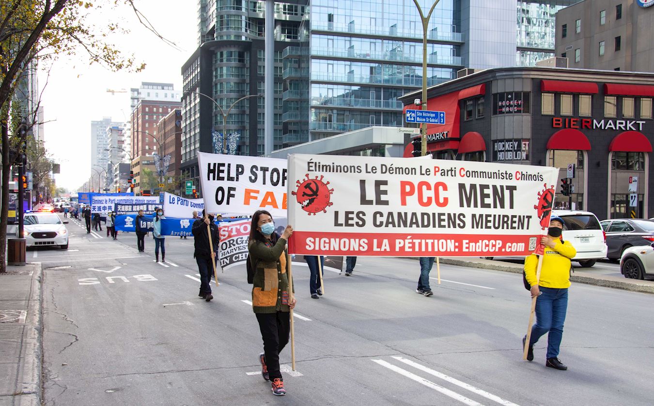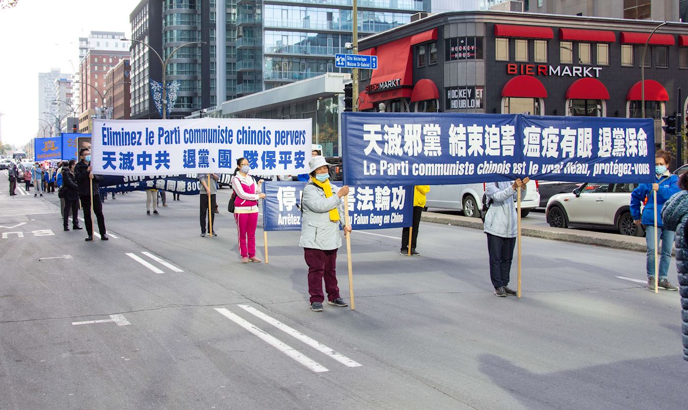 队伍缓缓行进,一幅幅中、英、法文组成的横幅展现在人们面前:“庆祝3.6亿中国人退出中共党团队组织”、“Le PCC ment Les Canadiens Meurent(中共撒谎让加拿大人付出生命代价)”、“停止活摘器官”、“Le Parti communiste chinois a blamer pour la pandemie(中共是大流行病的祸因)”、“停止迫害法轮功”、“天灭中共”等。