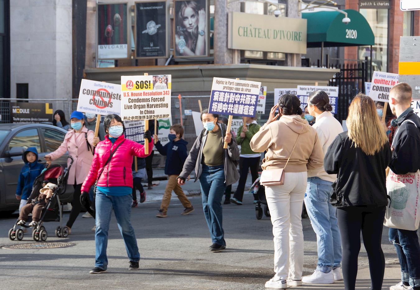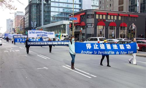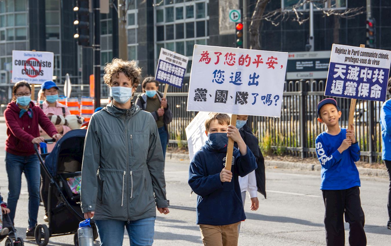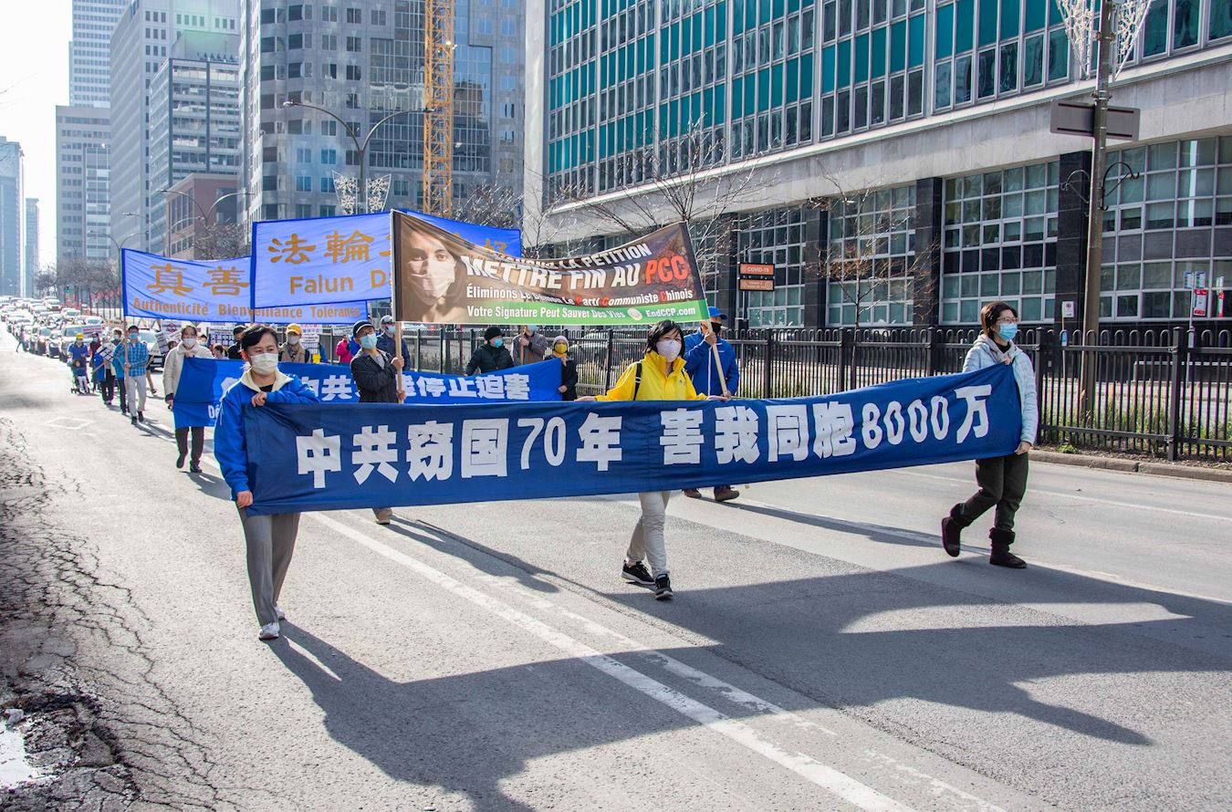 队伍缓缓行进,一幅幅中、英、法文组成的横幅展现在人们面前:“庆祝3.6亿中国人退出中共党团队组织”、“Le PCC ment Les Canadiens Meurent(中共撒谎让加拿大人付出生命代价)”、“停止活摘器官”、“Le Parti communiste chinois a blamer pour la pandemie(中共是大流行病的祸因)”、“停止迫害法轮功”、“天灭中共”等。