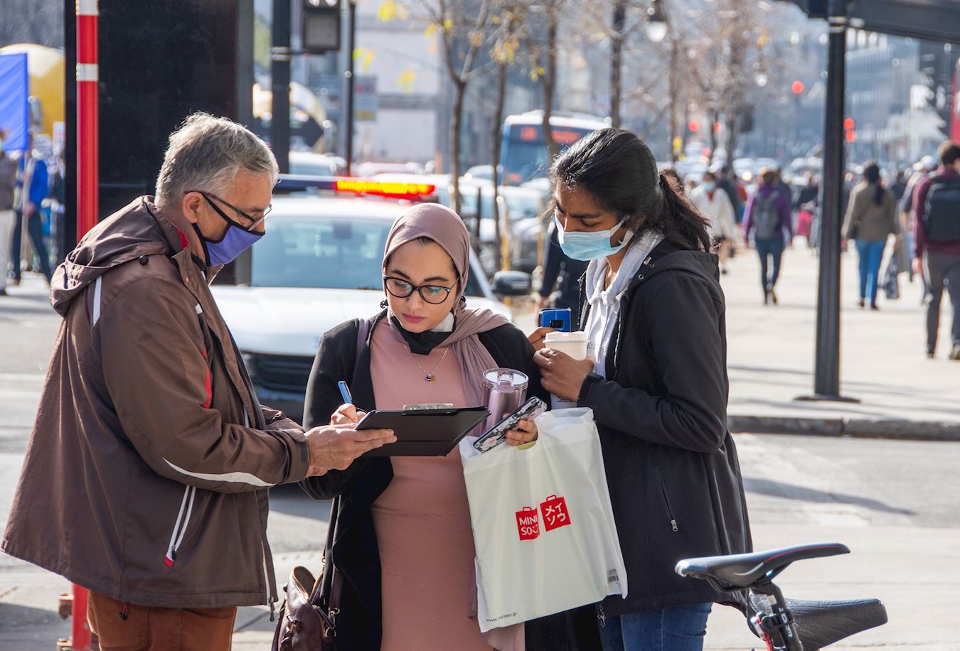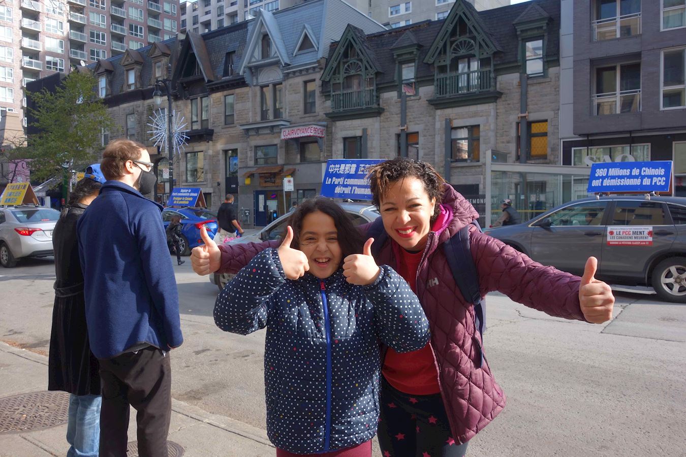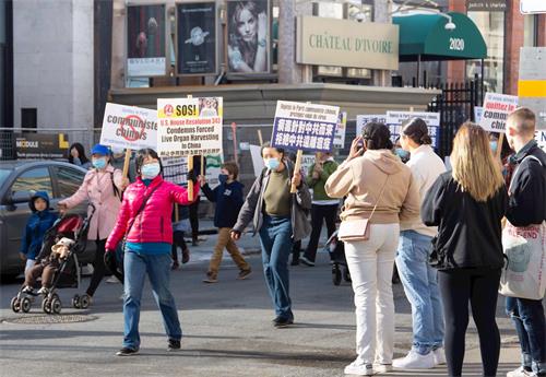 横幅、展板、车队,汇集成一股巨大的真相队伍,出现这座被誉为“北美小巴黎”的城市里。路旁、车里、店里的人们拍照、竖大拇指、做V字手势,有人高兴地喊“加油”,还有人加入到游行队伍中来一起走。