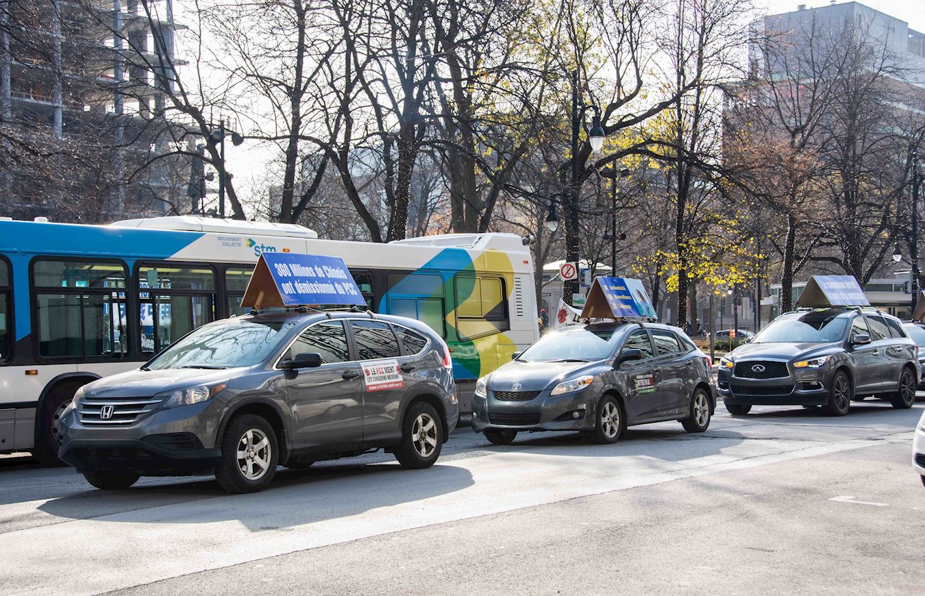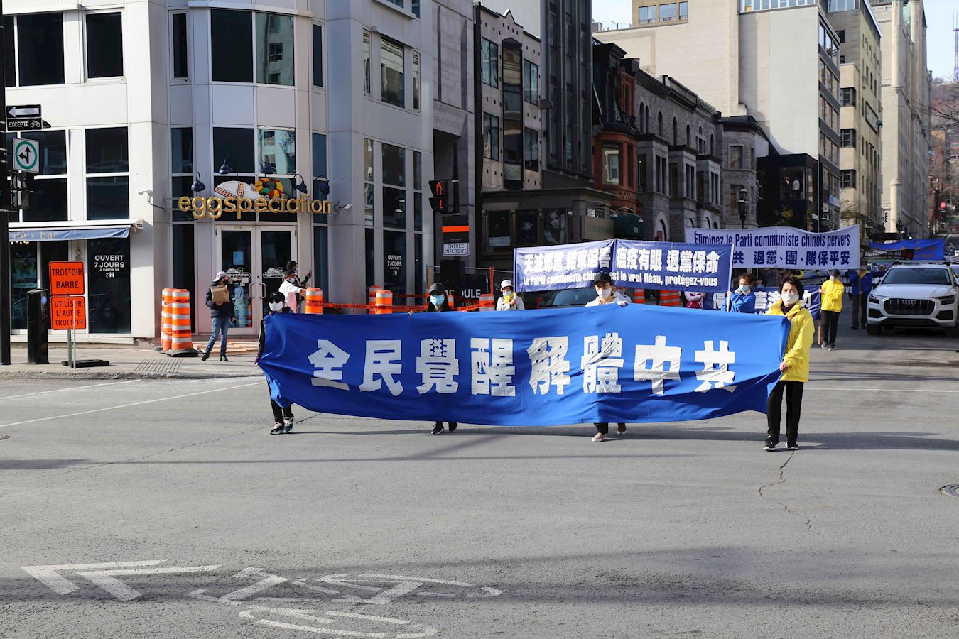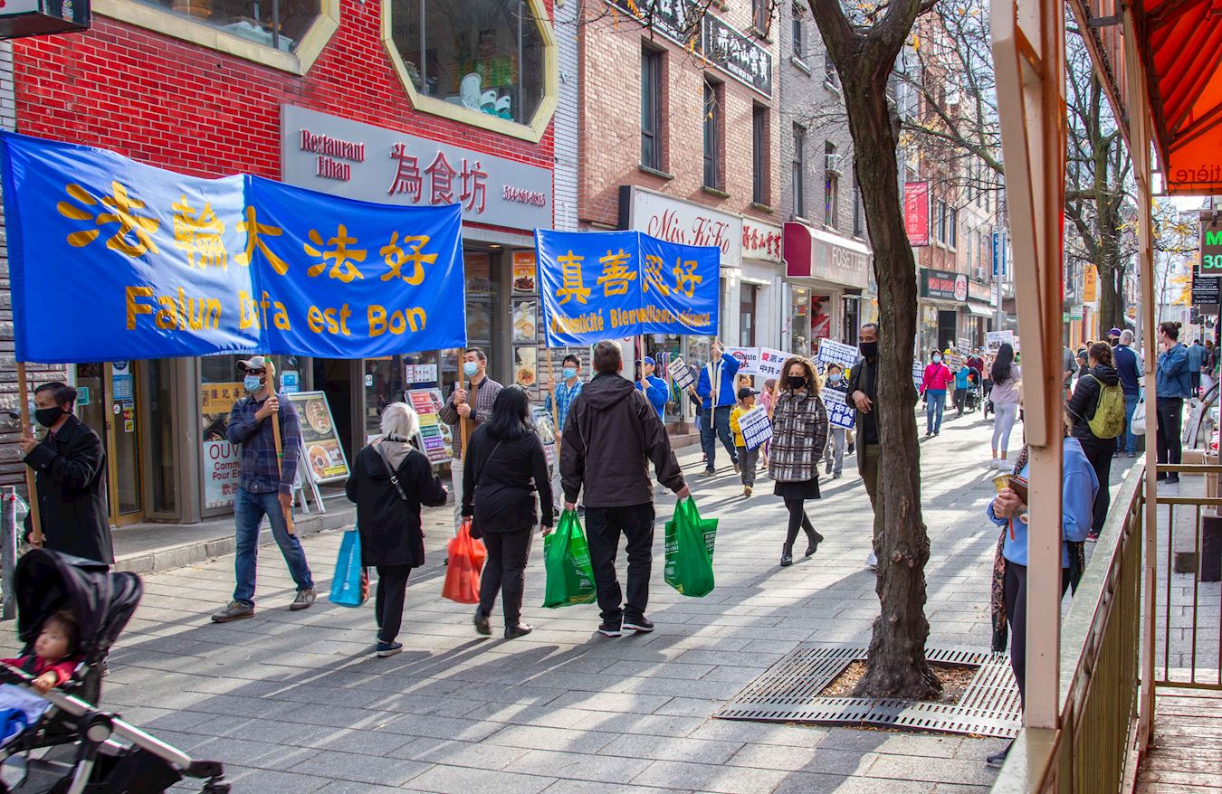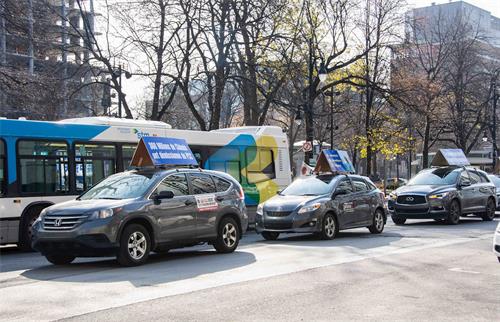 警车在前方开道,浩浩荡荡的游行队伍由横幅方阵、抗议展板、真相车队组成,从卡博广场(Square Cabot)出发,沿着圣凯瑟琳大街、舍布鲁克大街、赫内李维斯克大街等繁华街区,终点抵达唐人街,全程四公里。