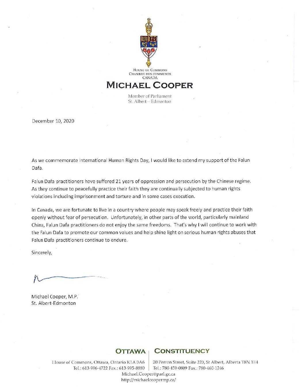 ![]() 图4:圣亚伯特-埃德蒙顿选区国会议员库珀(Michael Cooper)给法轮功学员的支持信 |