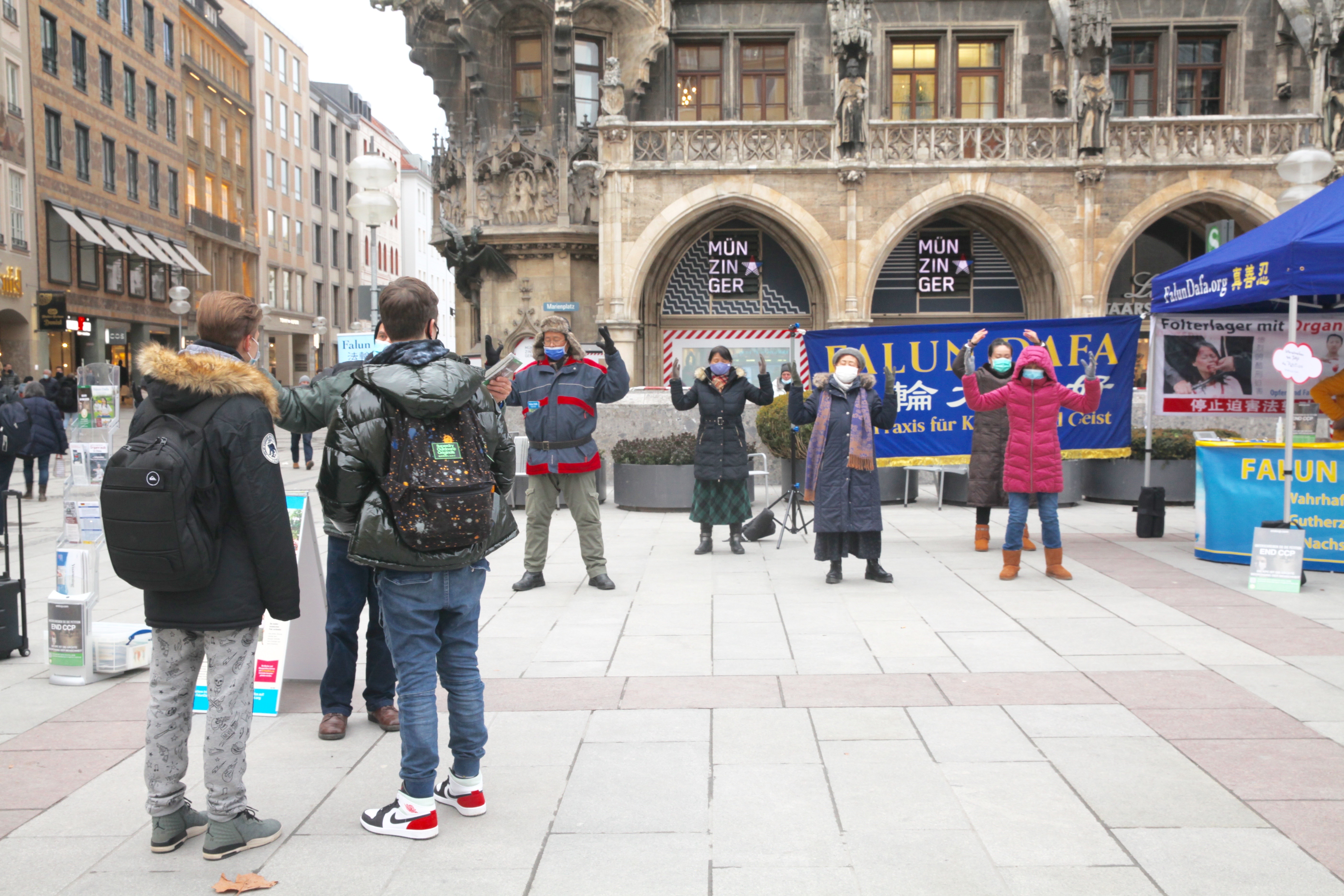 ![]() 图2:二零二零年十二月七日,法轮功学员在市中心玛琳广场(Marienplatz)展示功法。 |