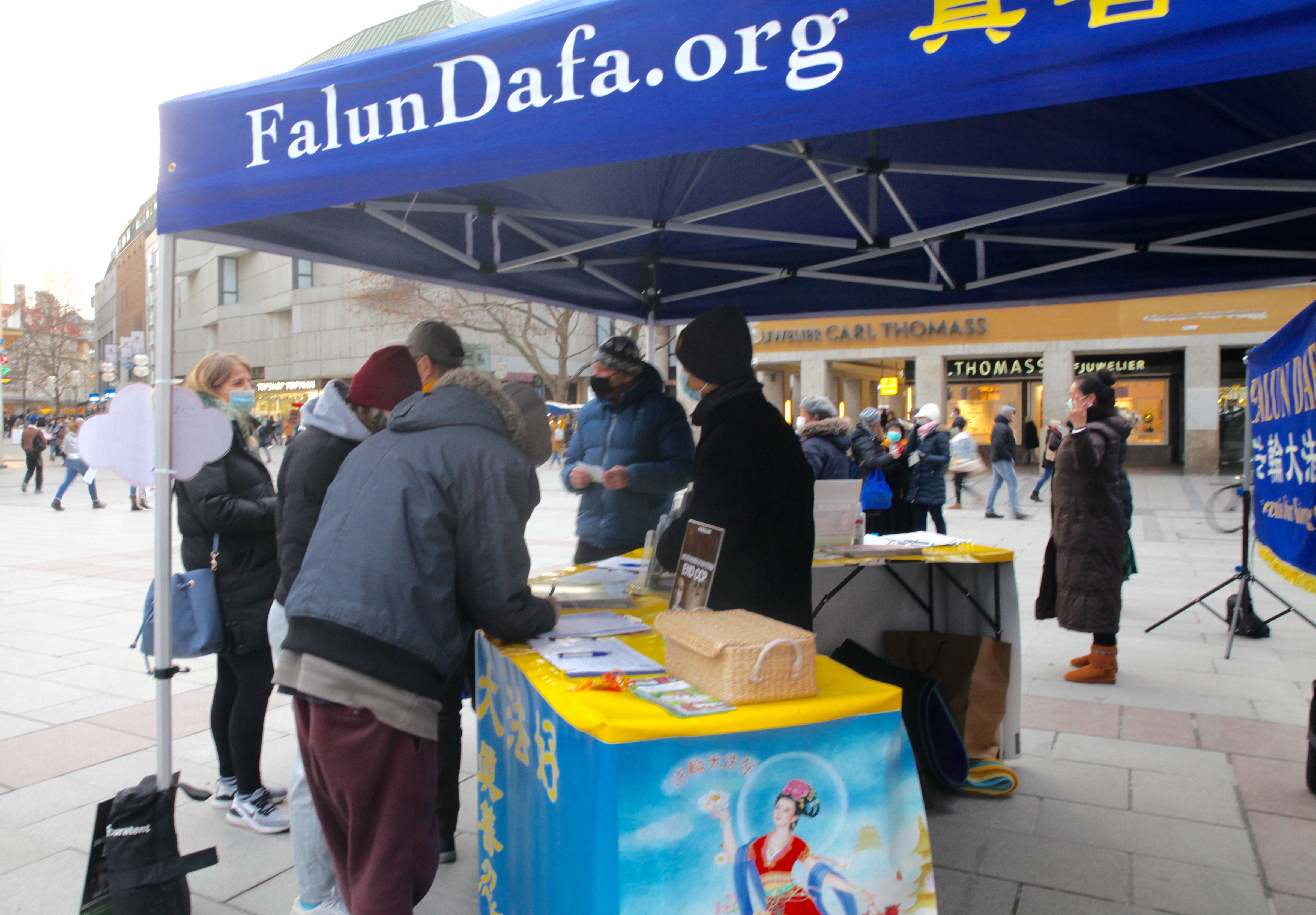 十二月七日,在市中心玛琳广场(Marienplatz),普拉茨尔先生(Melvin Platzer)和朋友跟法轮功学员交谈了很久,从什么是法轮功到中共为什么要迫害法轮功、如何能帮助法轮功学员等,他问的很详细,法轮功学员一一解答。