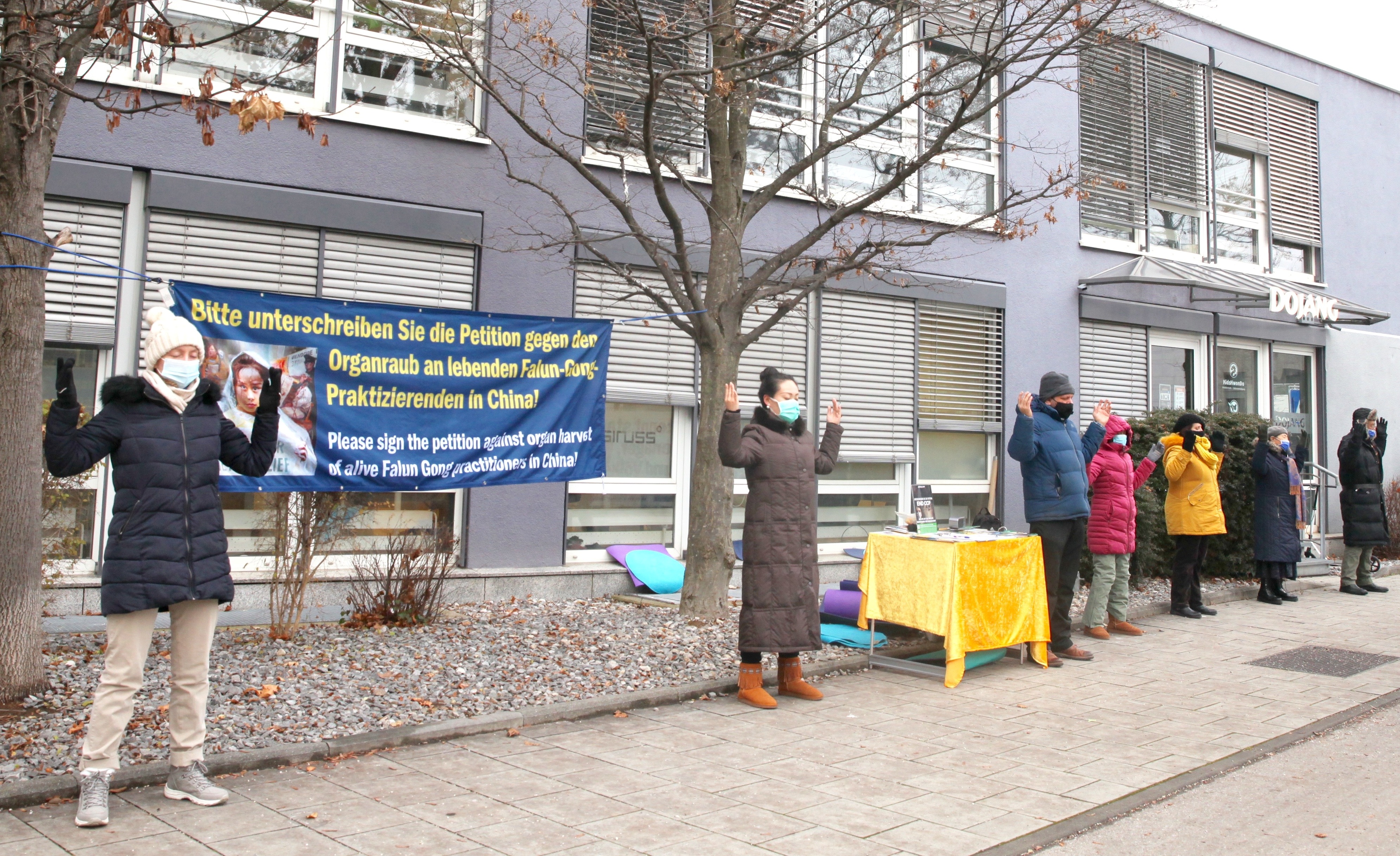 十二月十日,法轮功学员在慕尼黑中领馆前举办活动,抗议中共。住在附近的人对此并不陌生,因为法轮功学员每周都在这里举办抗议活动。