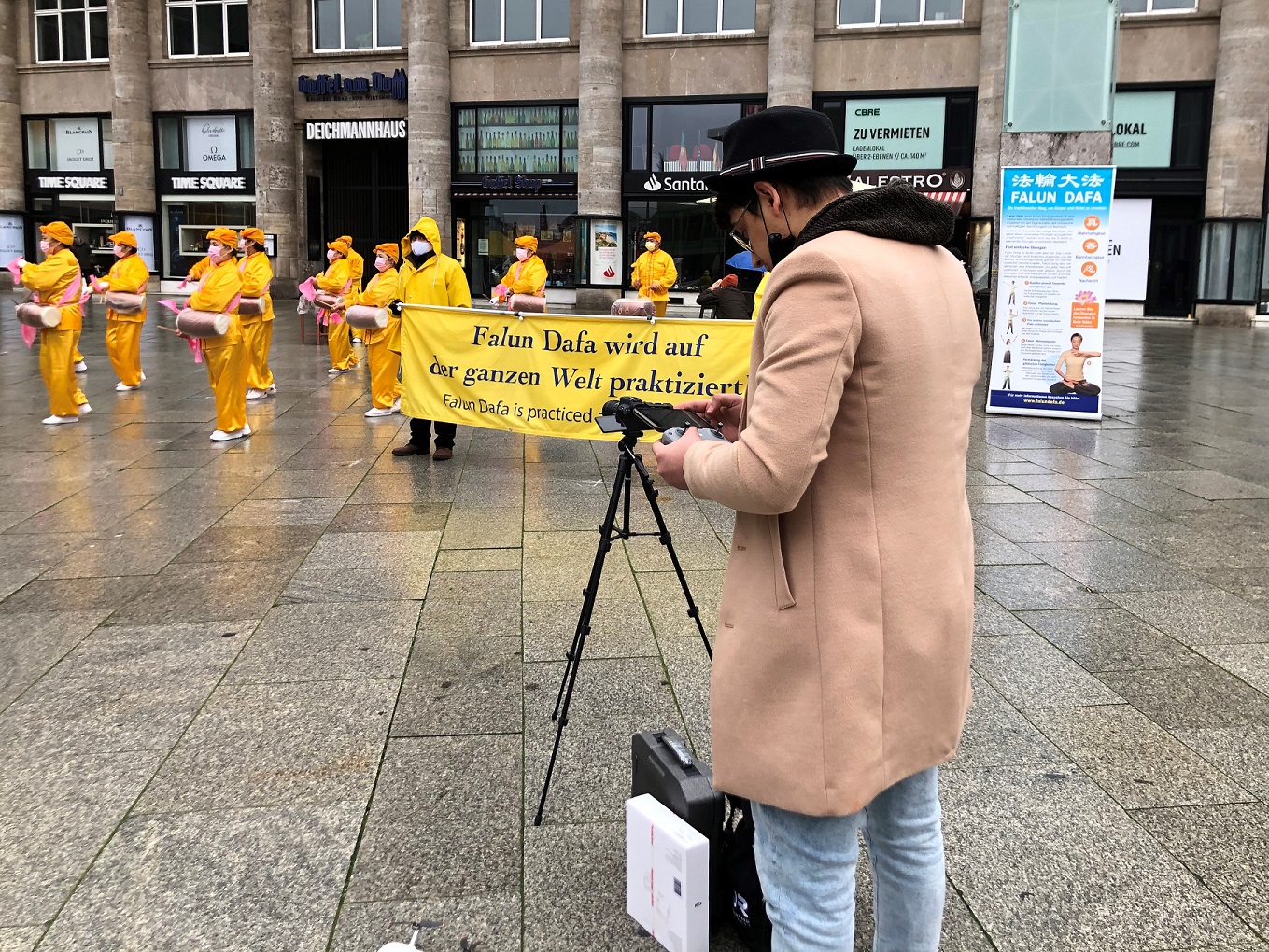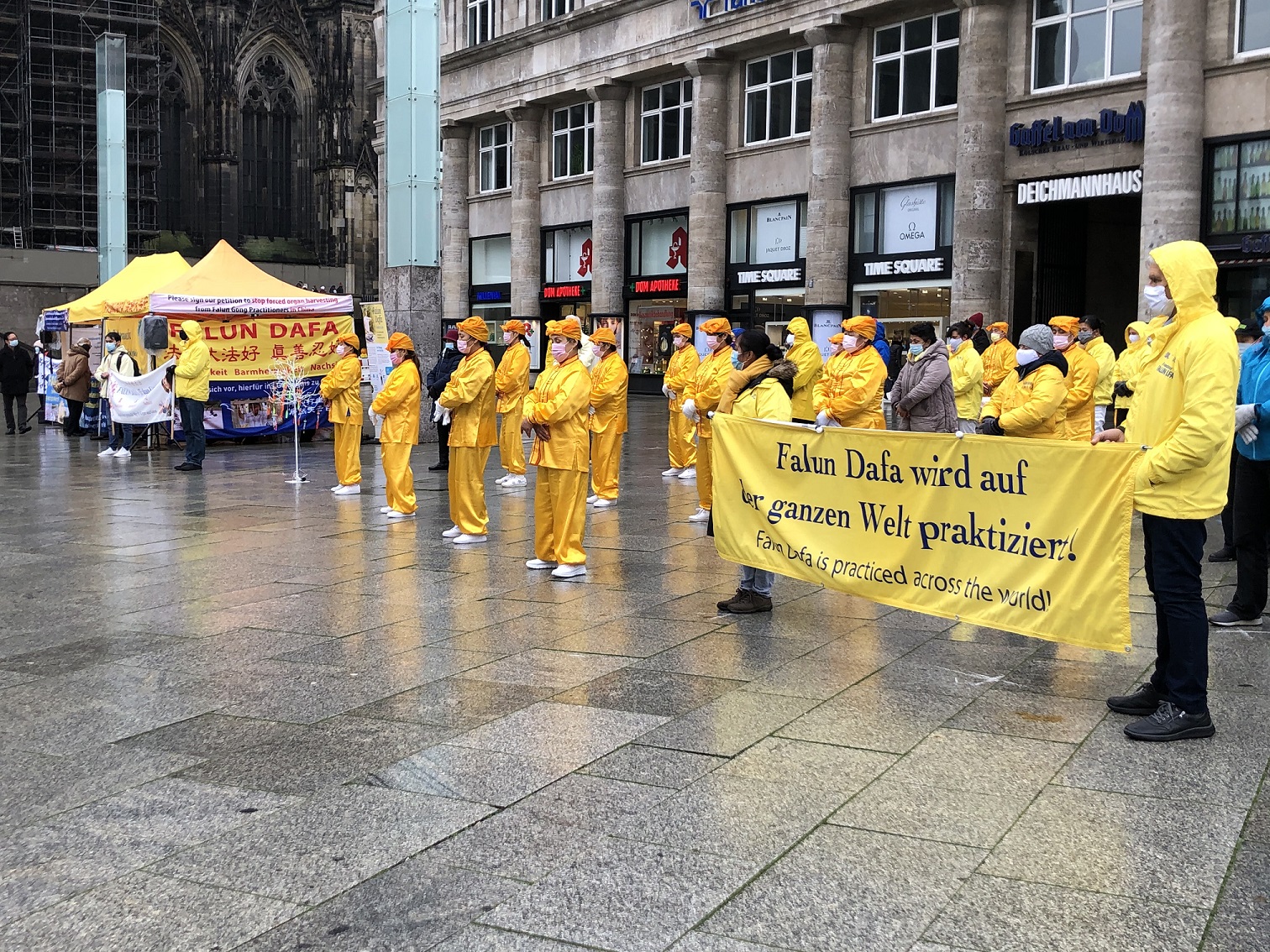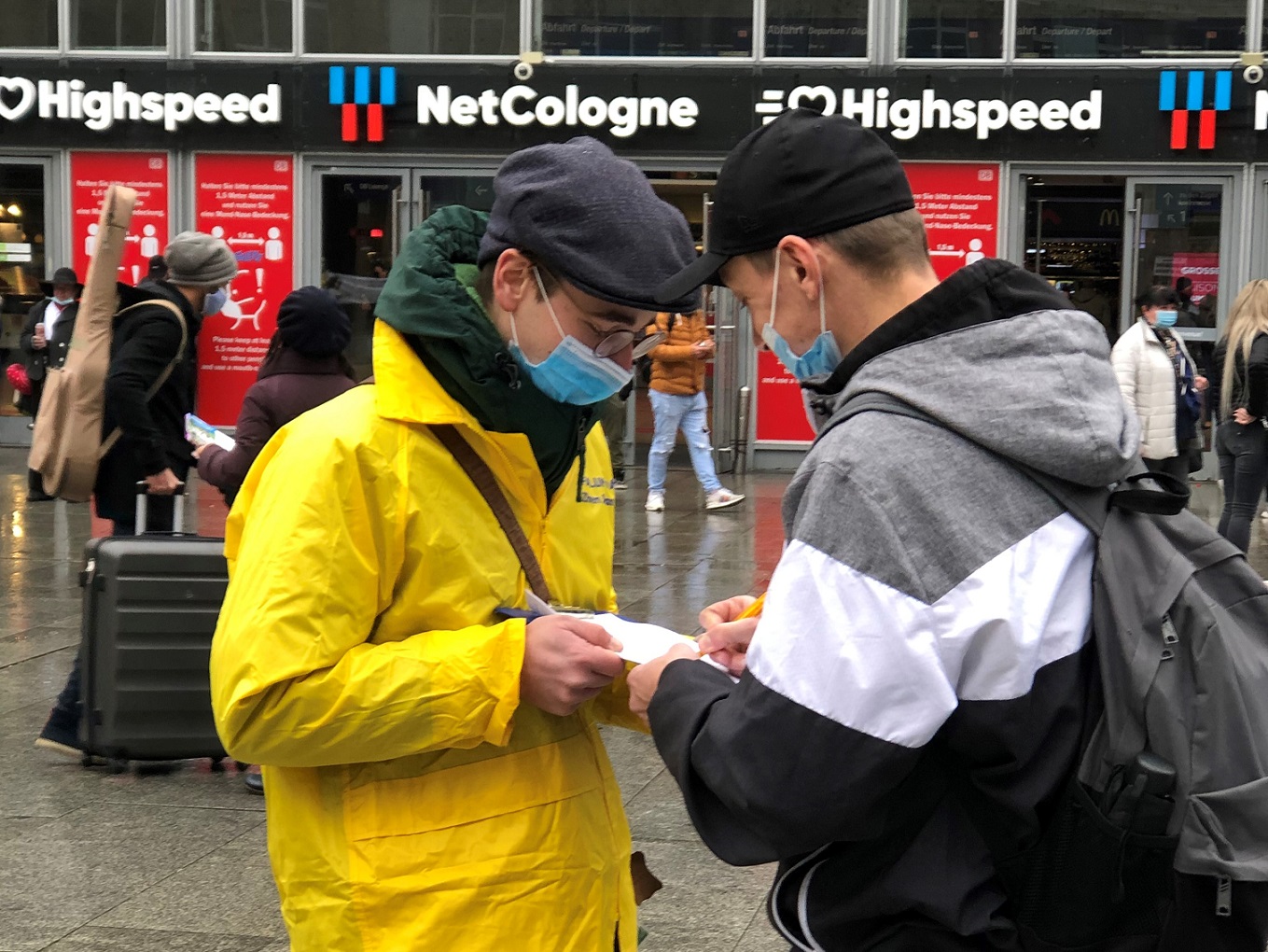 ![]() 图1:二零二零年十二月十二日法轮功学员在科隆火车站前的广场上举办讲真相活动 |