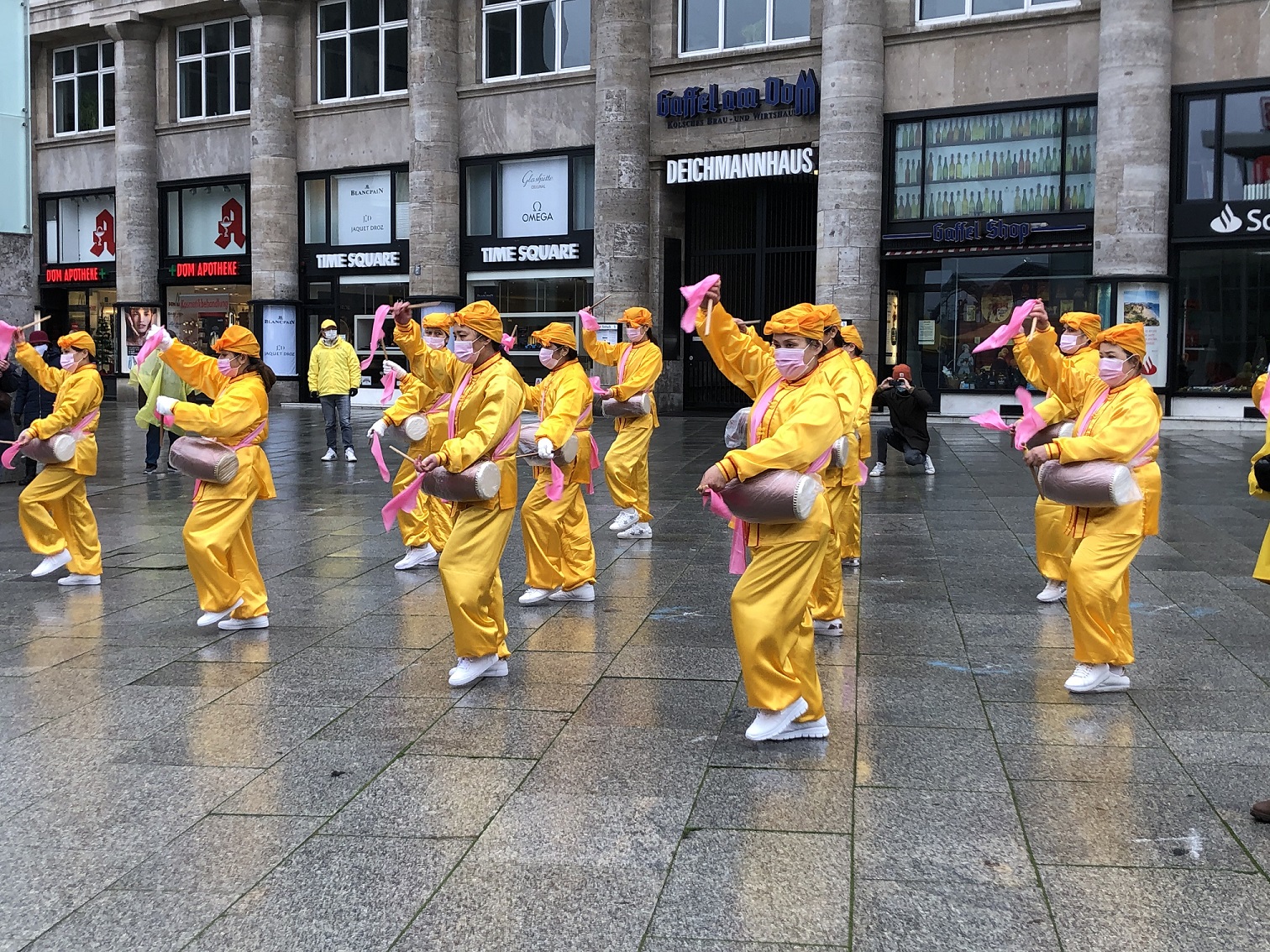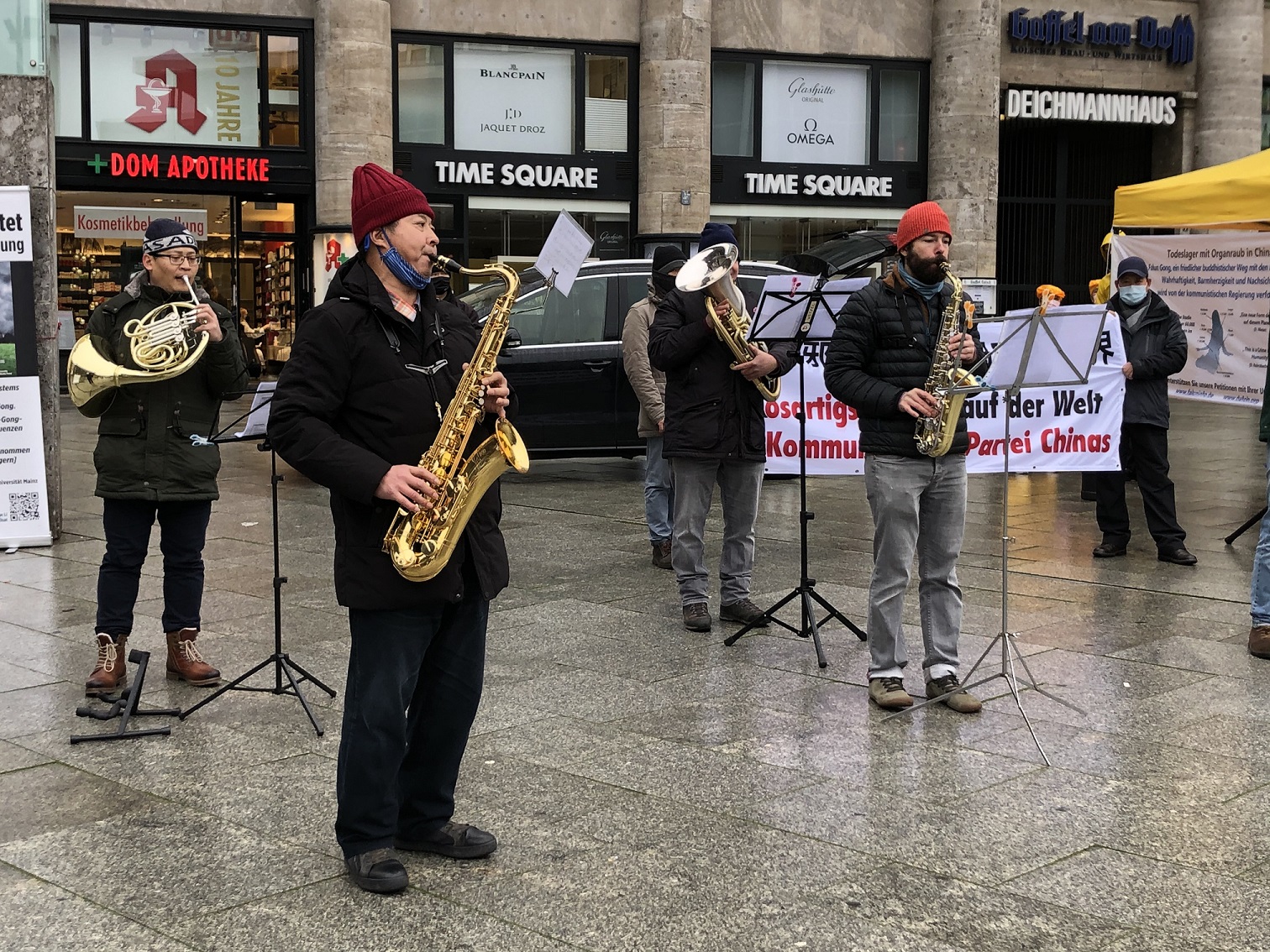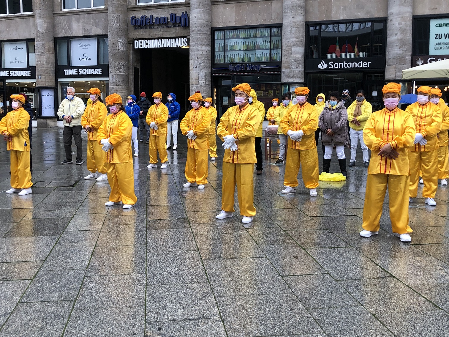 ![]() 图1:二零二零年十二月十二日法轮功学员在科隆火车站前的广场上举办讲真相活动 |