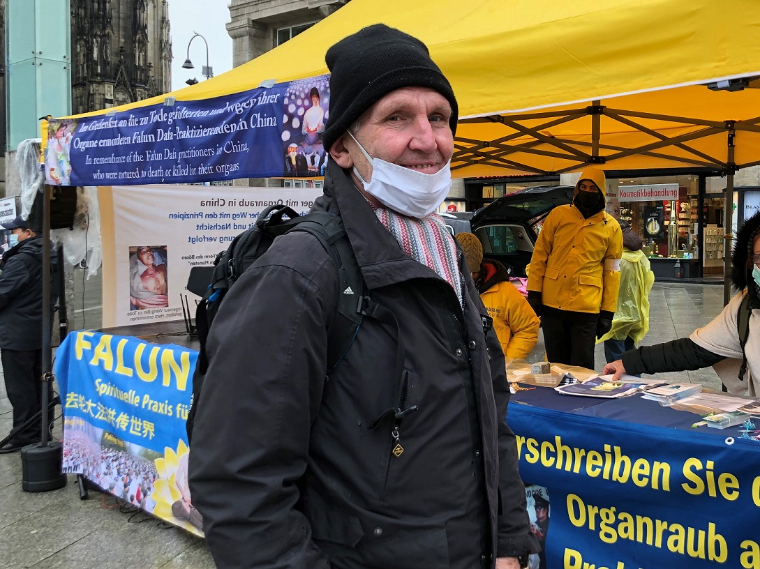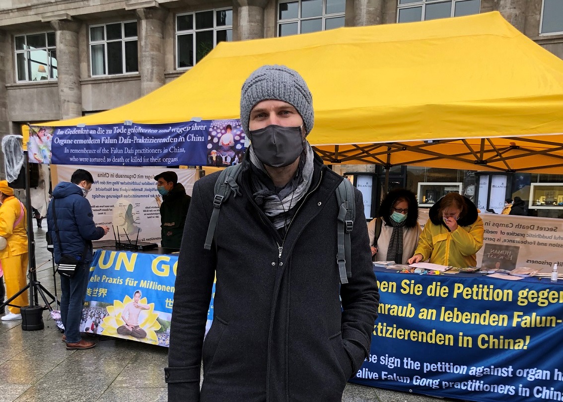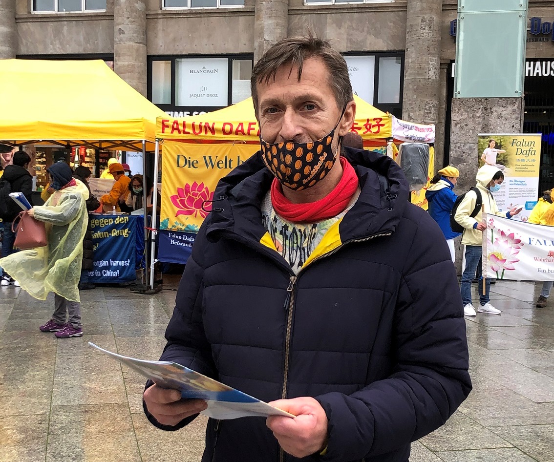 约尔格(Joerg)在签名支持制止迫害后,继续停留了很久,观看功法演示。他谈到,两年前他就听说过中共活摘器官的暴行,并搜索过相关的资料。当天的活动让他对法轮功产生了兴趣。