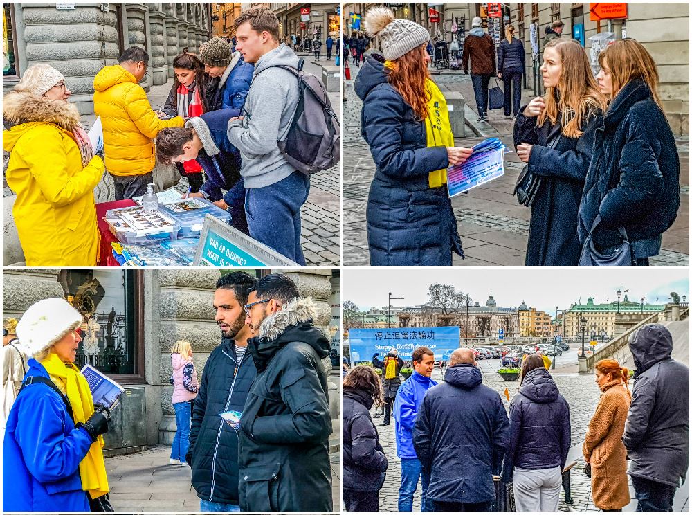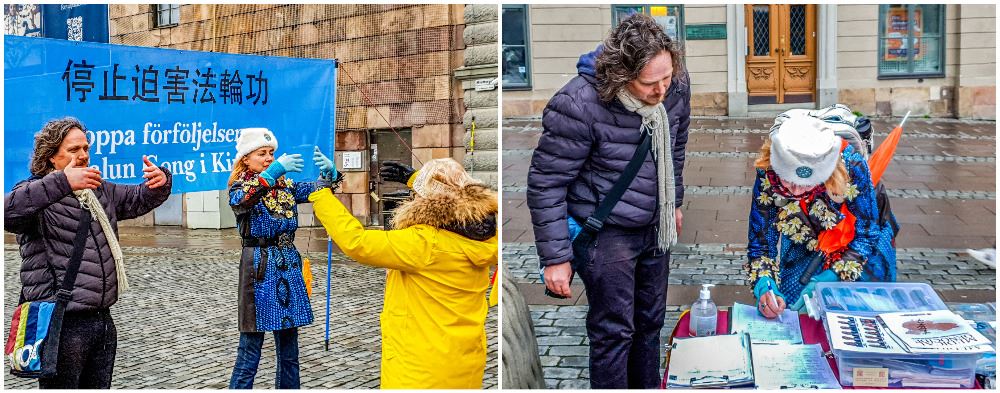 宁静、祥和的活动现场吸引了不少在雨中匆匆行進的民众驻足、前来了解真相。打着雨伞的瑞典女士珍妮(Jenny)和她的朋友是第一个走上前,打听详情。学员向她们讲述了中共迫害法轮功学员及活摘法轮功学员器官的真相后,珍妮双手抱住了头,震惊道:“怎么会这样?!”签了名后她告诉学员:“我只知道新疆、西藏、香港被中共迫害得很惨,没想到中共竟然活摘法轮功学员的器官,如此残暴的杀害自己的同胞、太恐怖啦!你们冒雨在为中国受迫害的群体发声真的是了不起!我当然要支持!”