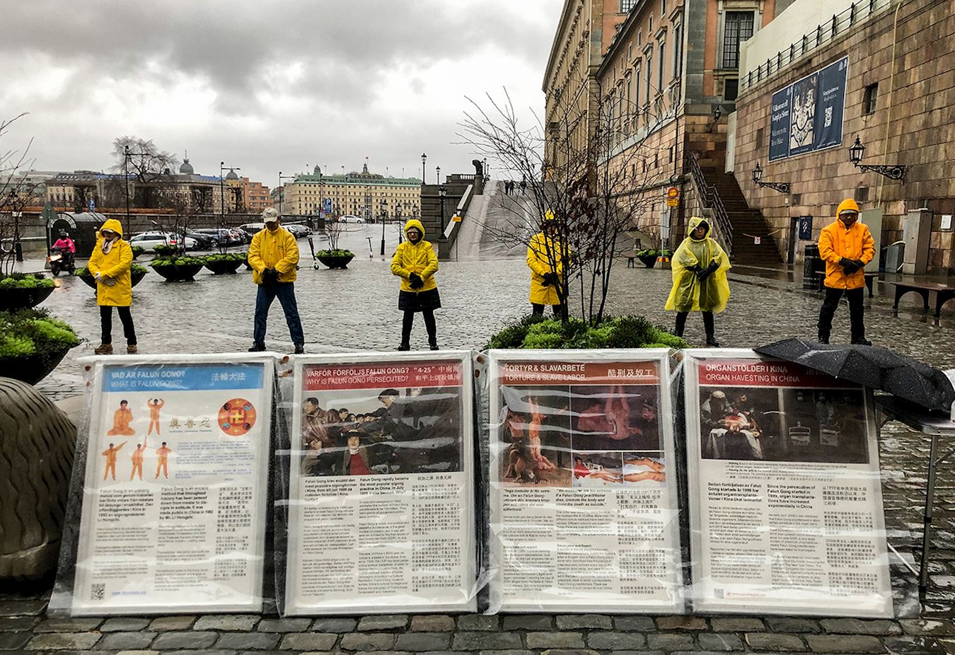 ![]() 图1:法轮功学员每周三次在瑞典国会大厦旁向世人传播真相 |