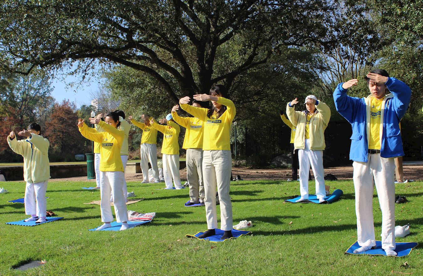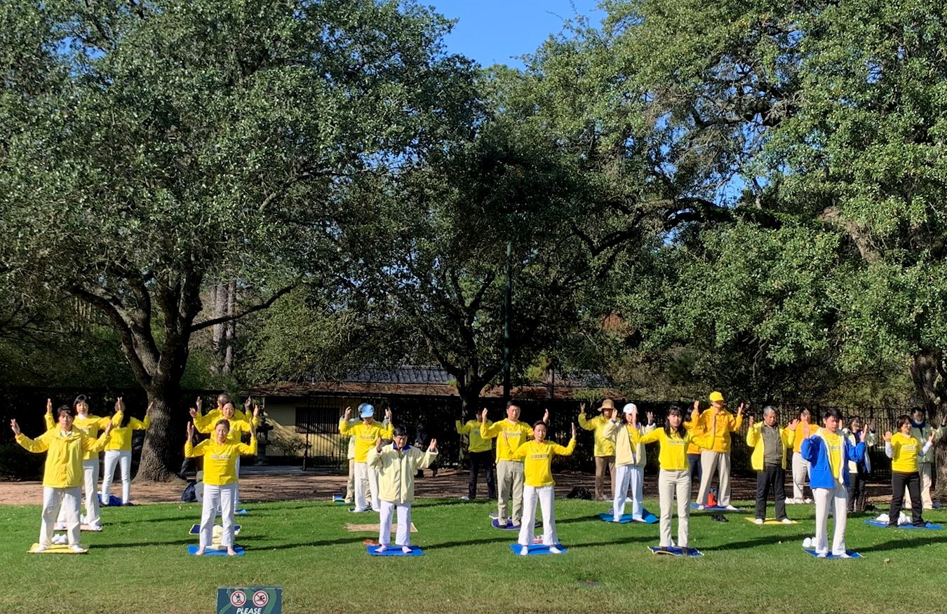 ![]() 图1:法轮功学员在休士顿荷门公园集体炼功 |