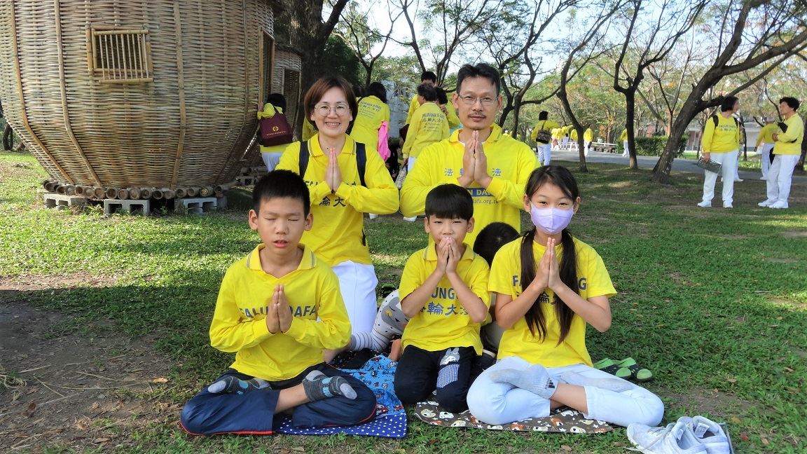 同样在学校任职的国中老师俪芬与先生柏萱,修炼大法十八年,当天,夫妻俩带着四个孩子来向师父拜年。